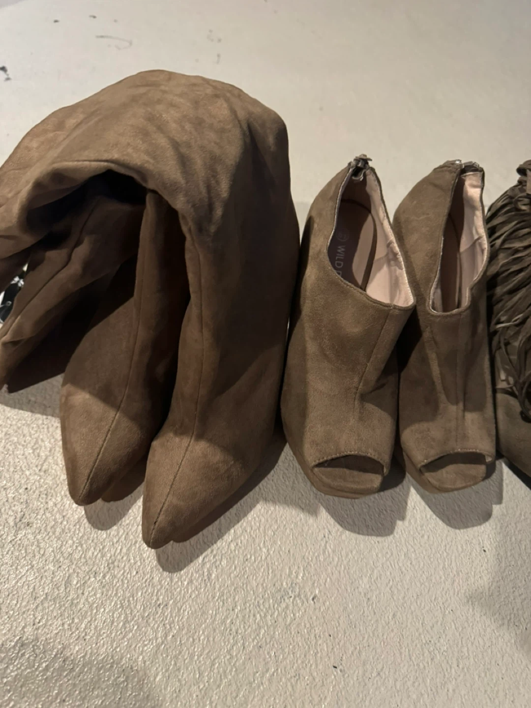 Selling a collection of Wild Diva brown suede boots. There are several styles, including ankle boots, peep-toe heels, and over-the-knee boots. Great for adding a touch of boho chic to your wardrobe!