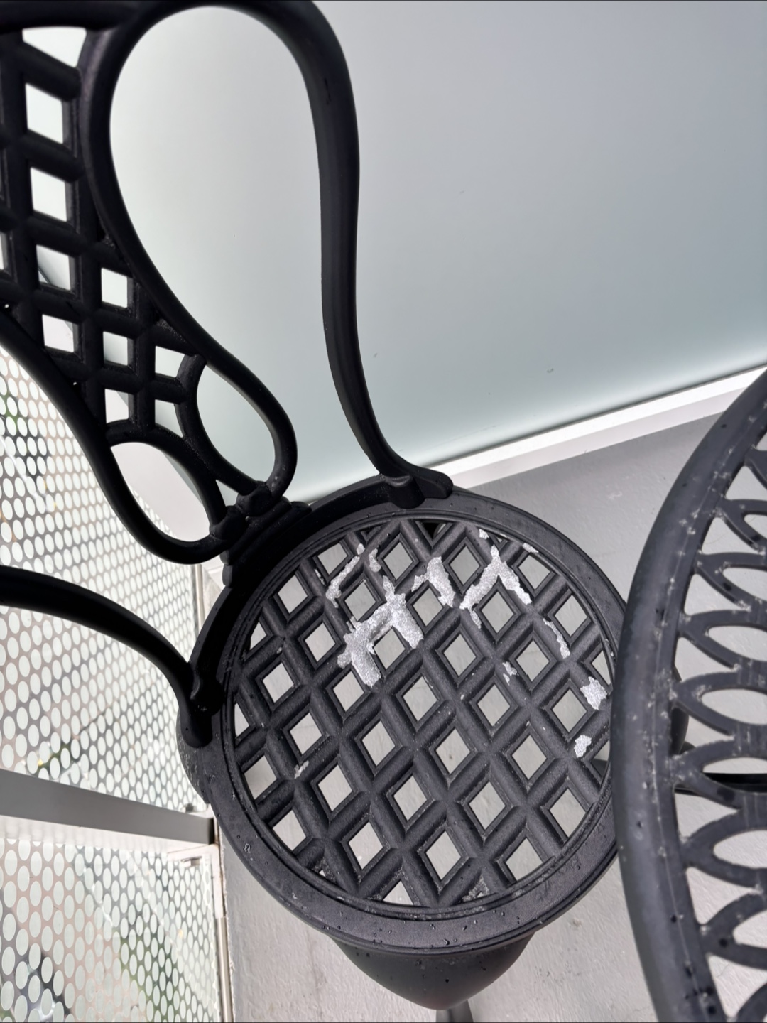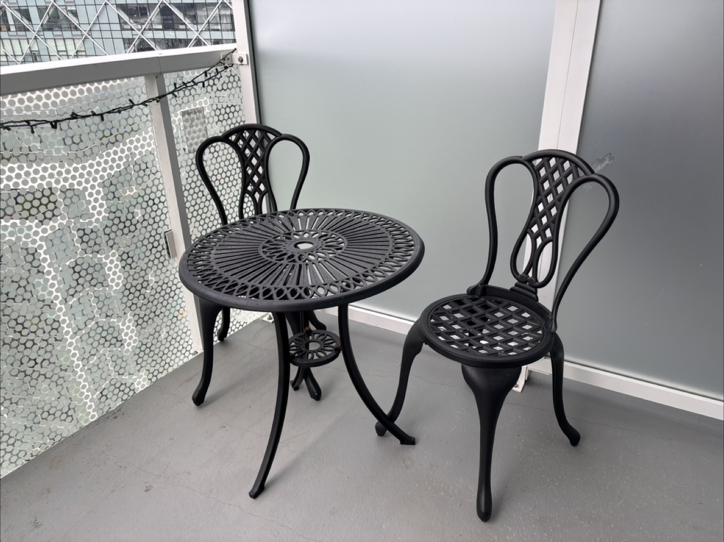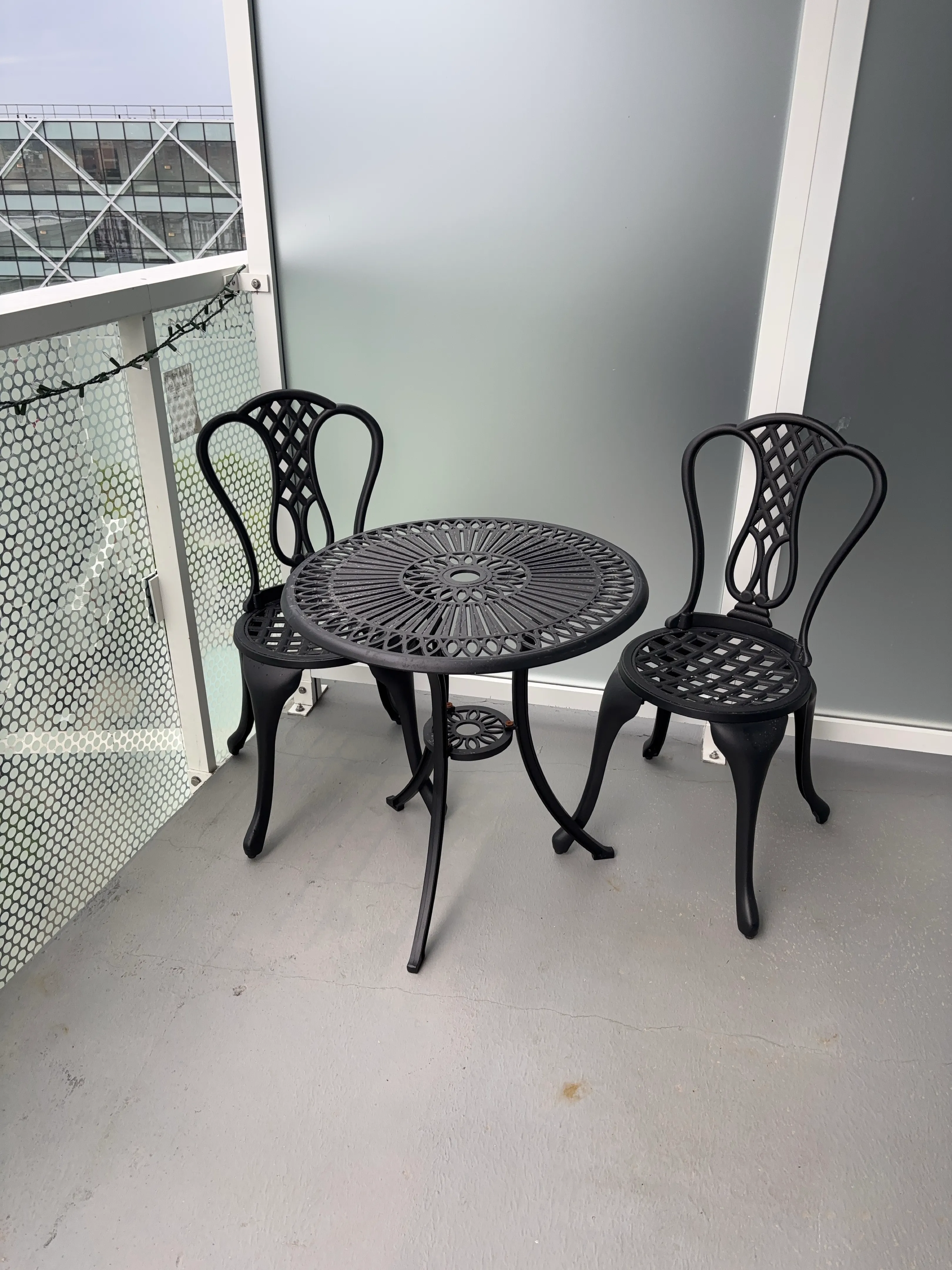 Black metal patio set. Includes round table and two chairs. Ideal for small balconies or patios. Some minor paint chipping. Price reflects