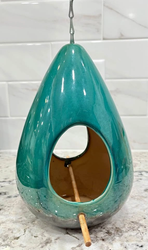 Beautiful aqua green blue teardrop shaped birdfeeder with access on both the front and the back comes equipped with hanging chain and hook.