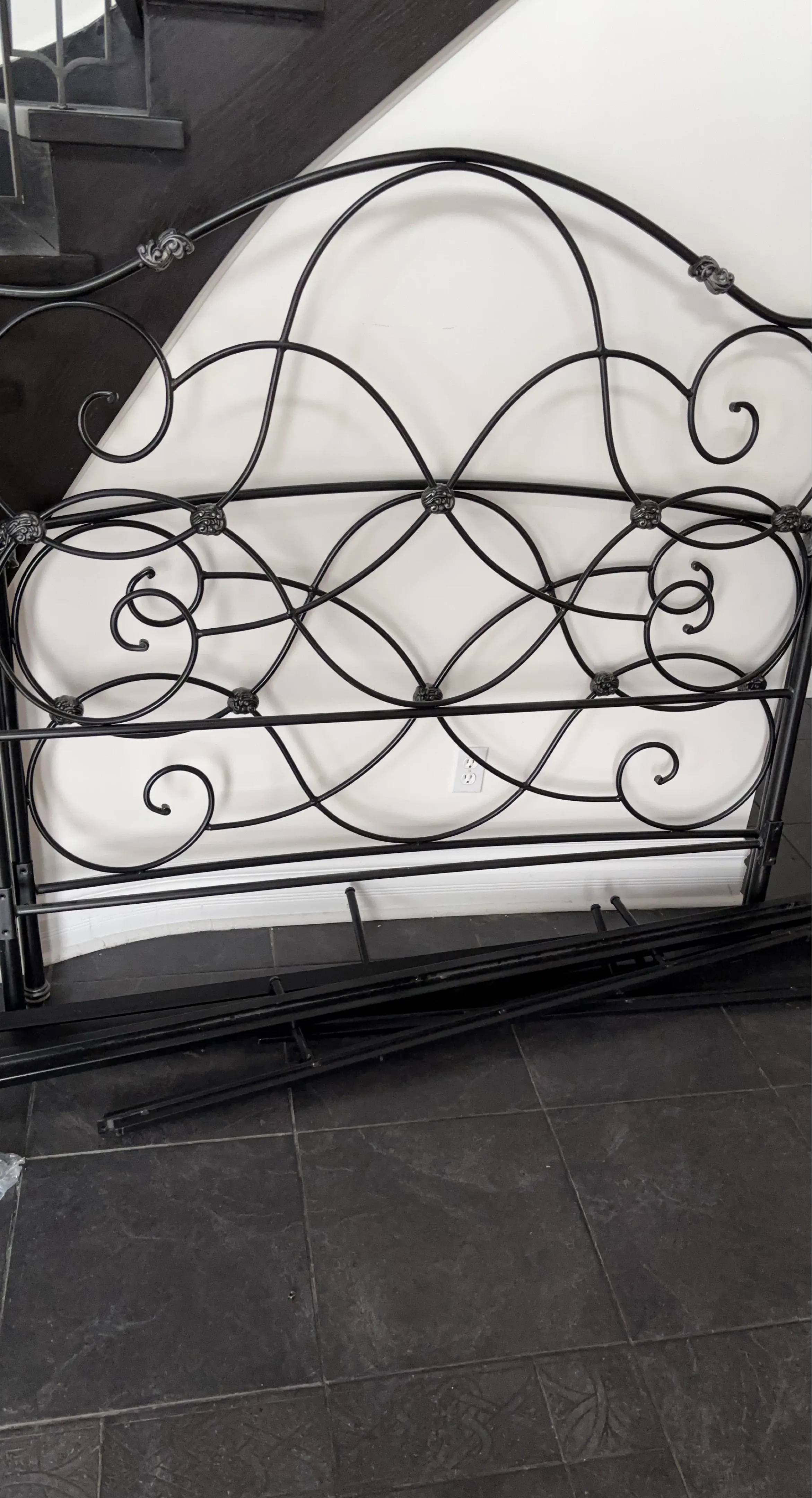 Black metal bed frame featuring intricate scrollwork details. Includes headboard, footboard, and side rails. Easy to assemble!
