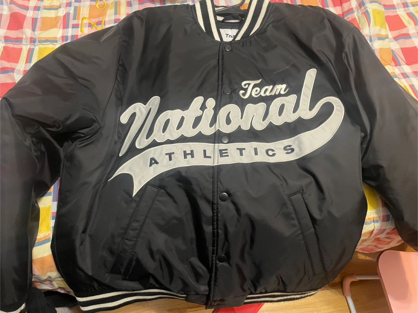 Black satin bomber jacket with 'Team National Athletics' embroidered on the front. Ribbed cuffs, collar, and hem. Snap button closure. This jacket's classic athletic design makes it a versatile layering piece.