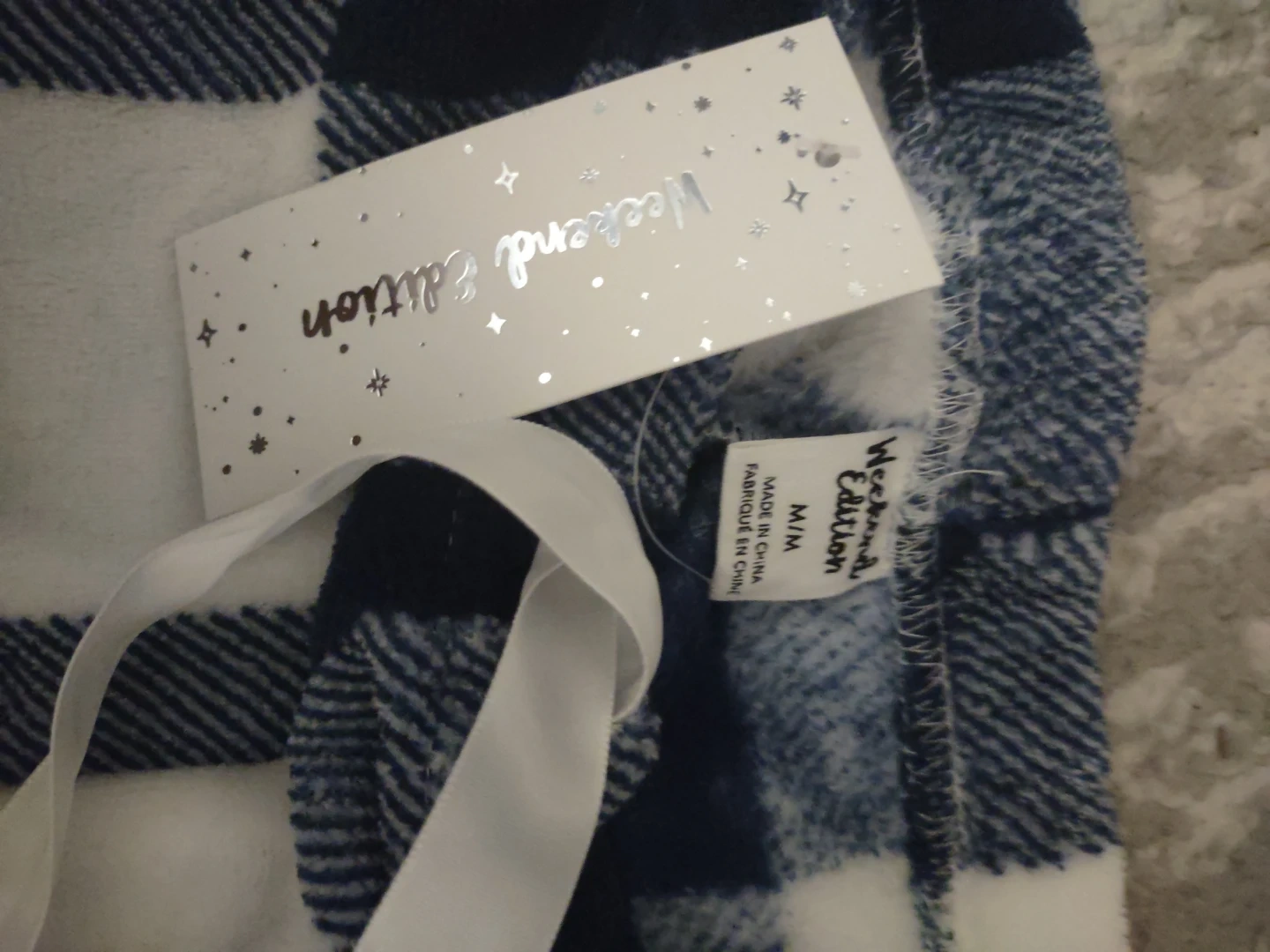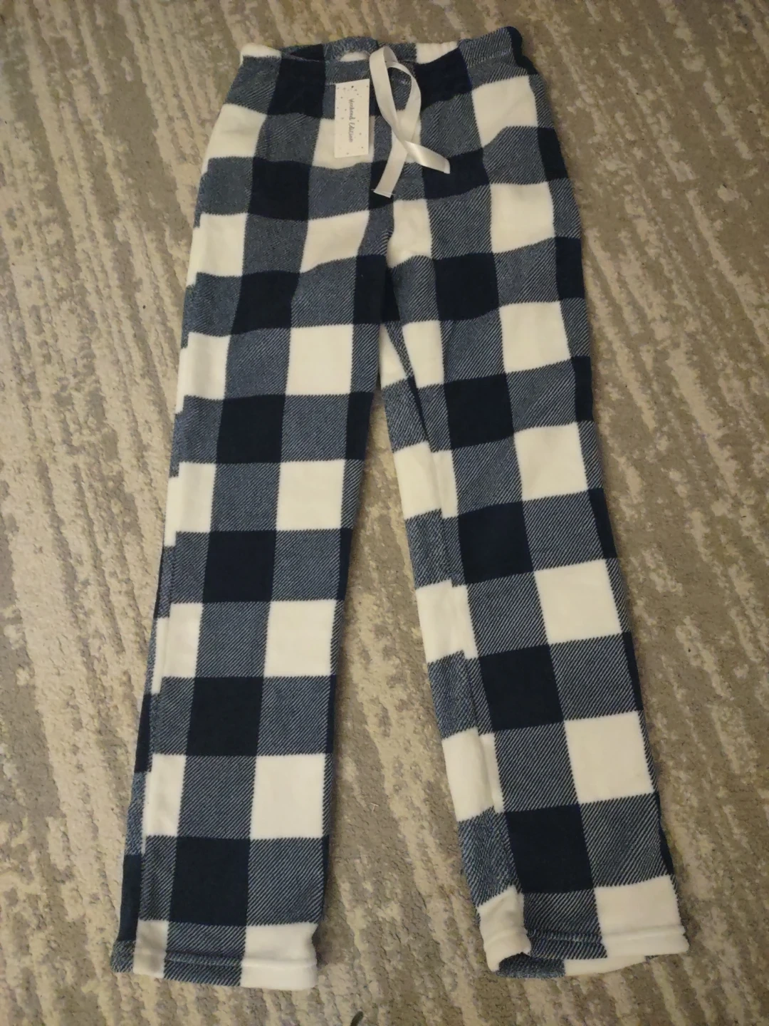 Cozy up with these Weekend Edition pajama pants! They're a comfy medium size with a classic blue and white plaid pattern. The tag shows they were originally $10.00, and they're in perfect condition, never worn.