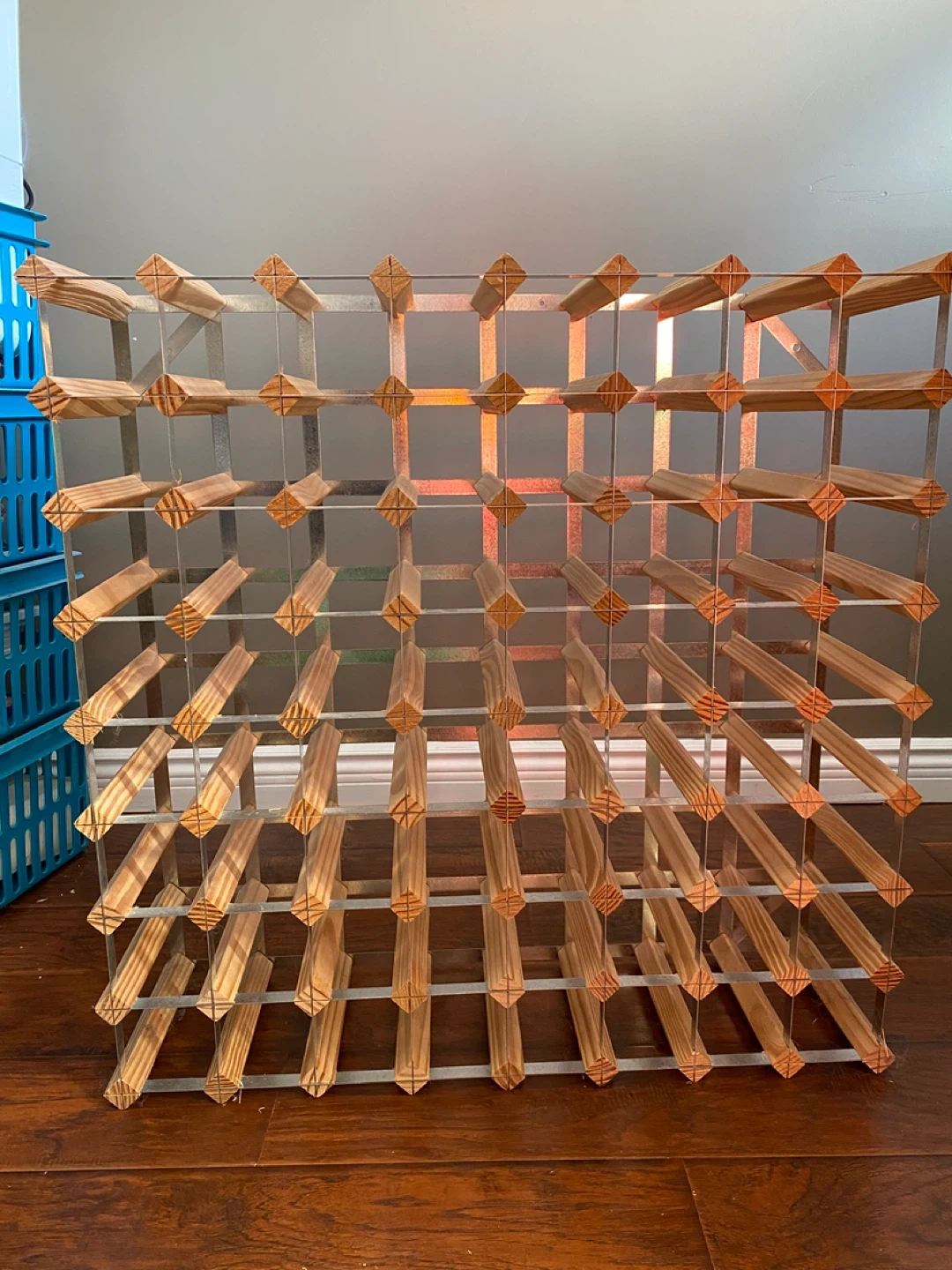 This wine rack holds multiple bottles with its wooden and metal construction. It's designed to store your wine collection neatly.