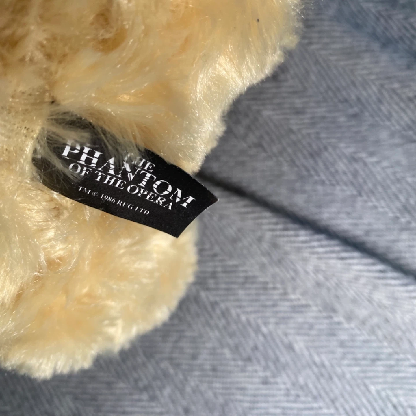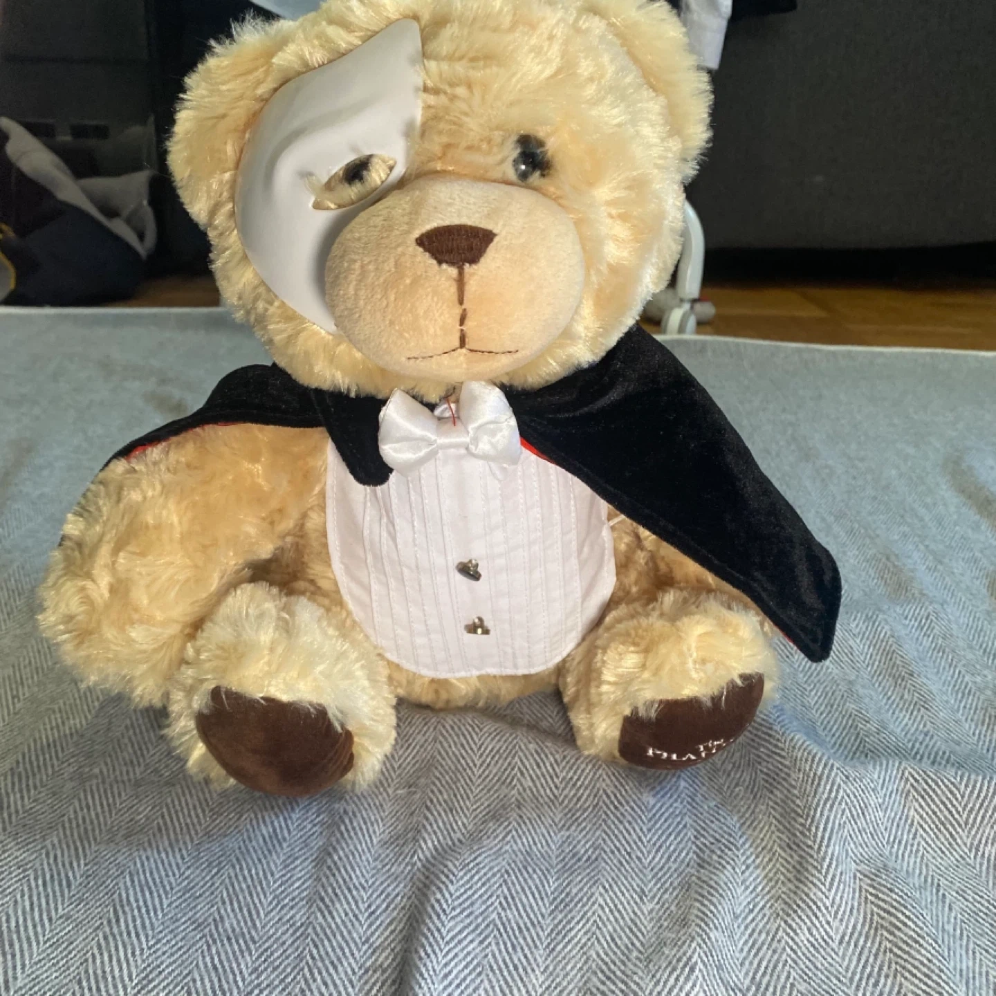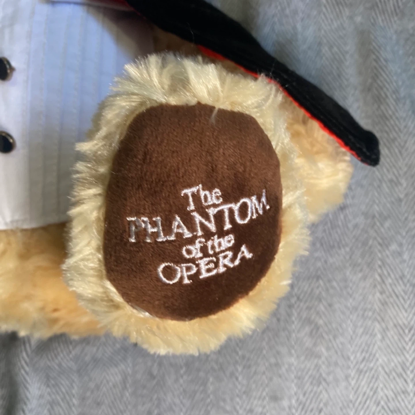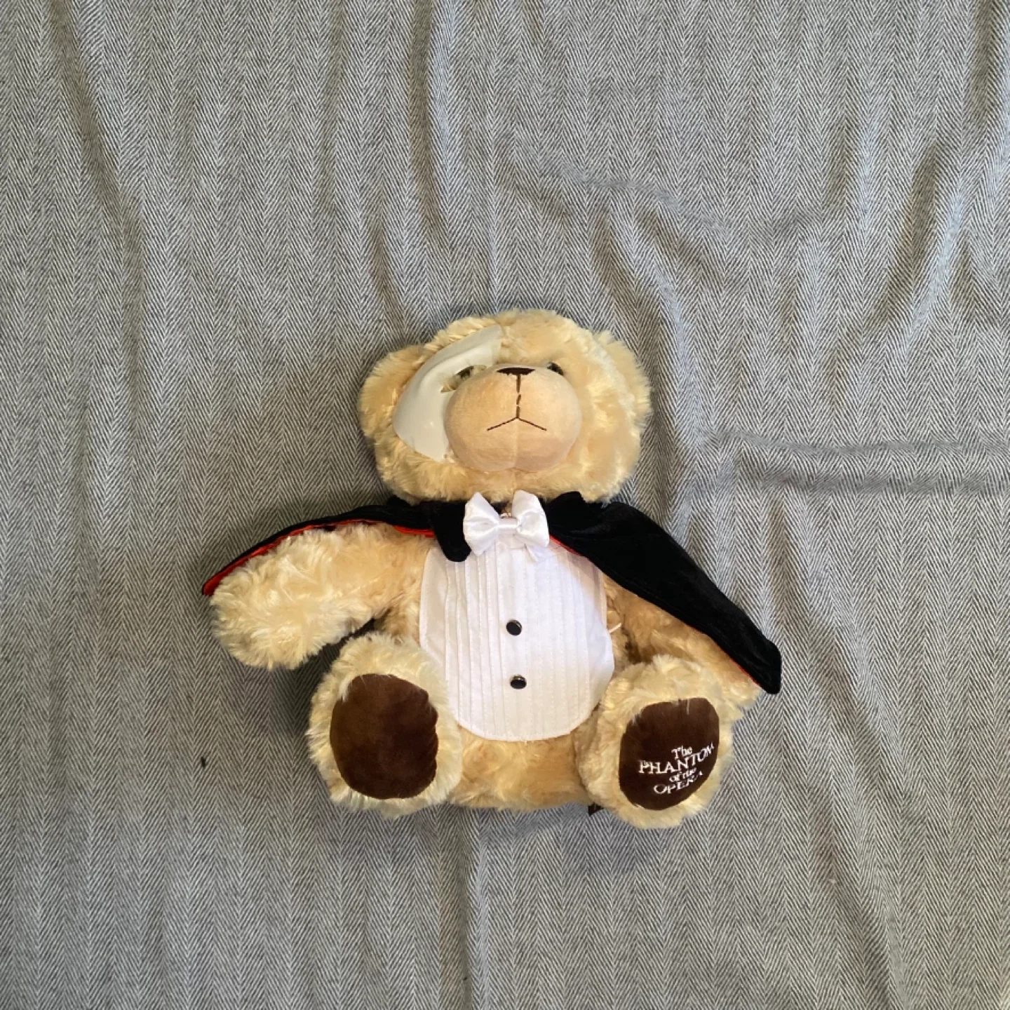 This is a cute teddy bear dressed as The Phantom of the Opera. It's wearing a tuxedo and a cape. A white mask is also on its face. The left paw has "The Phantom of the Opera" embroidered on it. It's a great collectible for fans! (Rare find)