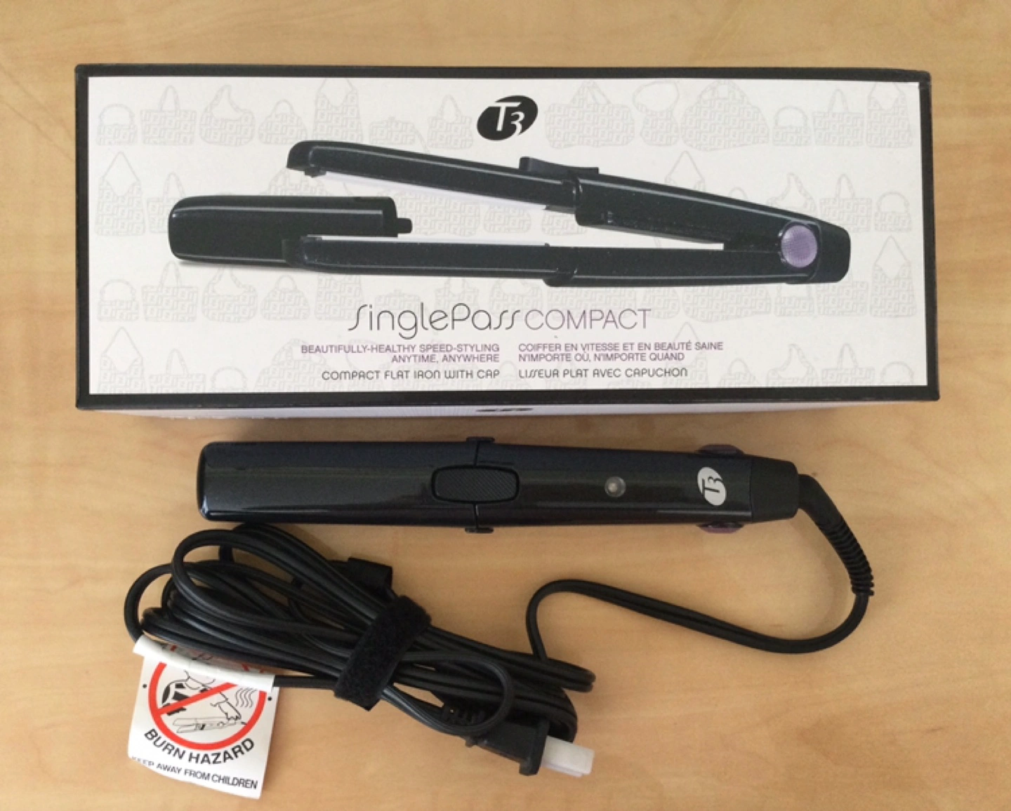 T3 SinglePass compact flat iron with cap, travel friendly.