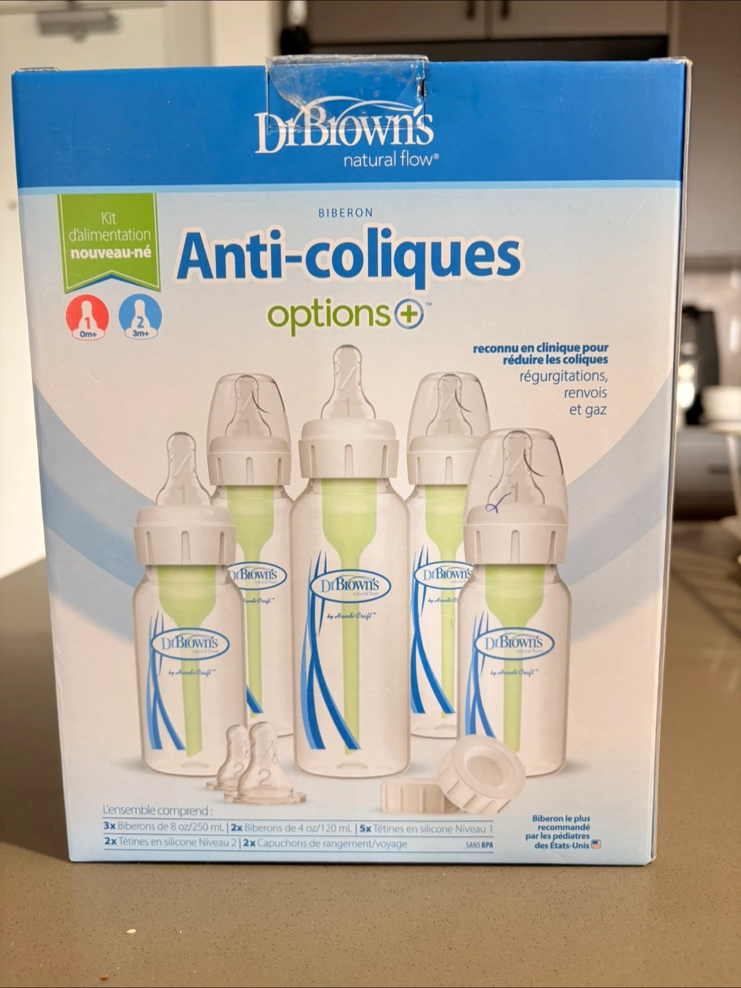 36I'm selling a brand new unused Dr. Brown's Natural Flow Anti-Colic Options+ Newborn Gift Set! This set is designed to reduce colic, spit-up, burping, and gas. It includes: - 3 x 8oz/250 mL bottles - 2 x 4oz/120 mL bottles - 5 x Level 1 nipples - 2 x Level 2 nipples - 2 x Storage/travel caps - Anti-Colic vent cleaner It's BPA free and recommended for babies aged 0-3 months. The box is included! We got multiple gifts so selling few that are not required.