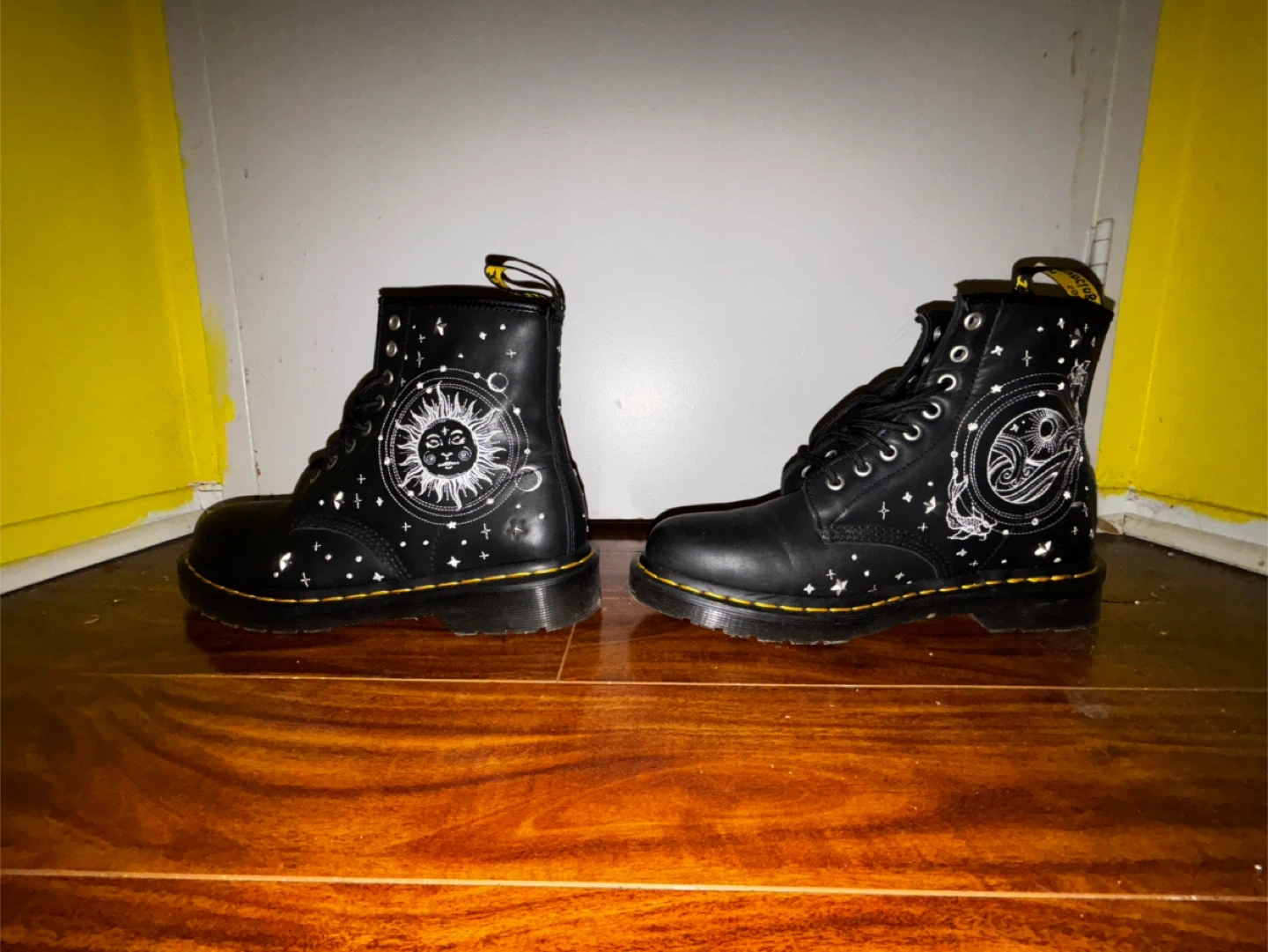 15Selling a pair of Dr. Martens 1460 Celestial boots in black. These boots feature a unique celestial design with sun and moon graphics. They're in great condition and ready for a new home!