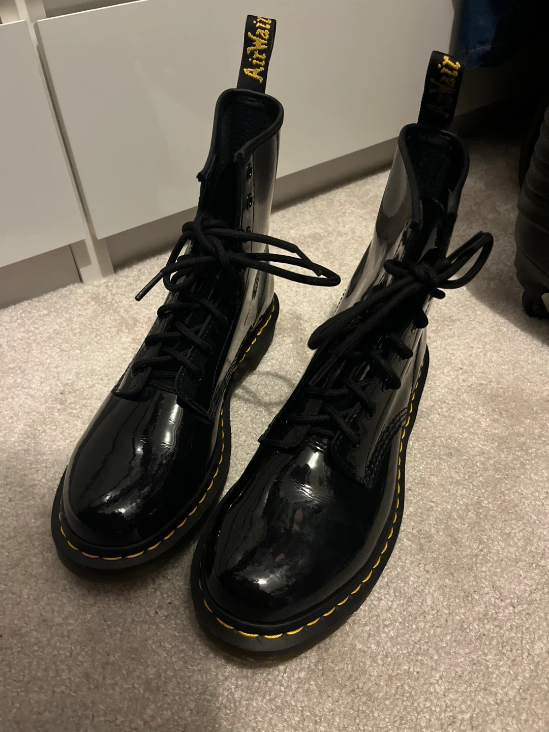 10Dr. Martens 1460 patent leather boots! They're a classic style with a shiny black finish. The iconic yellow stitching and AirWair bouncing soles add to the look. These boots are super durable and comfortable for everyday wear. I just never thought they suited my style so I haven’t worn them out of the house. Selling for $110. Women’s size 9