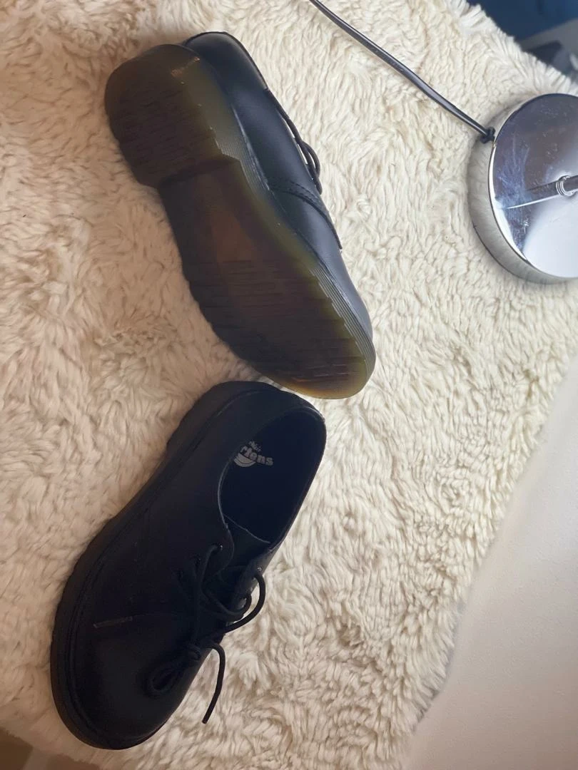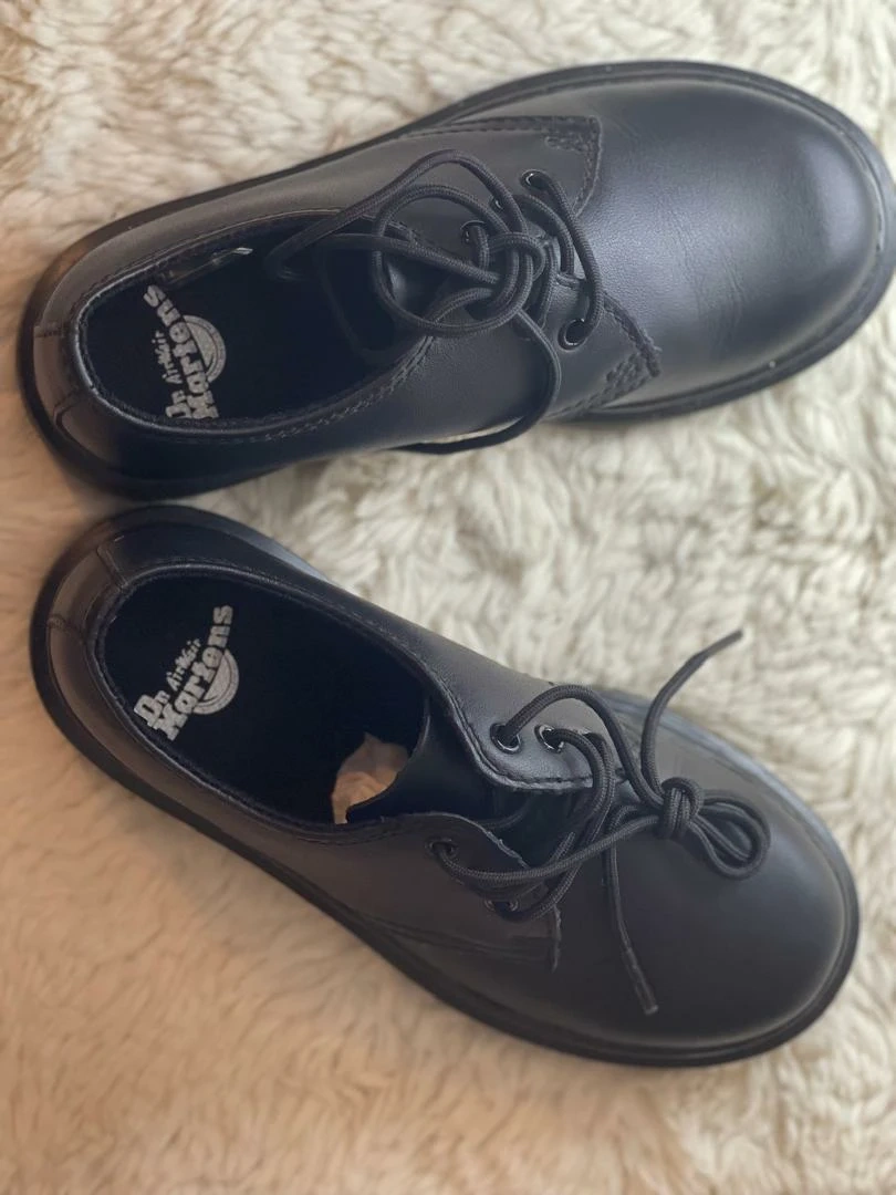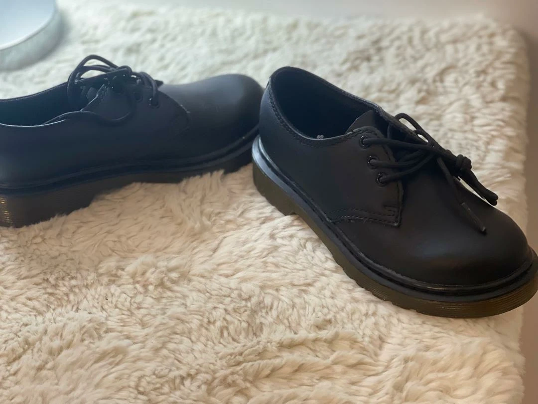 52Black lace-up shoes. The shoes feature a rounded toe. The soles appear to be made of rubber. Putting these on can be a nice way to start your kids day at school Original Price was $90