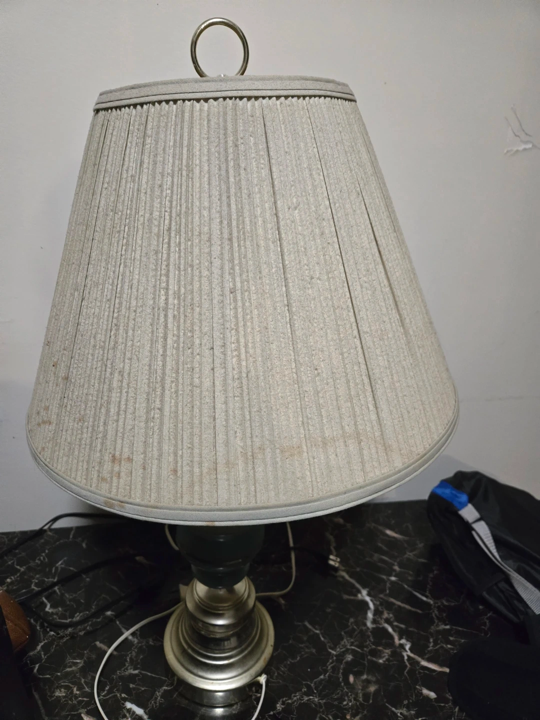 A classic table lamp with a metal base and a pleated fabric shade. This lamp's timeless design adds a warm glow to any room. It's perfect for a bedside table or desk.