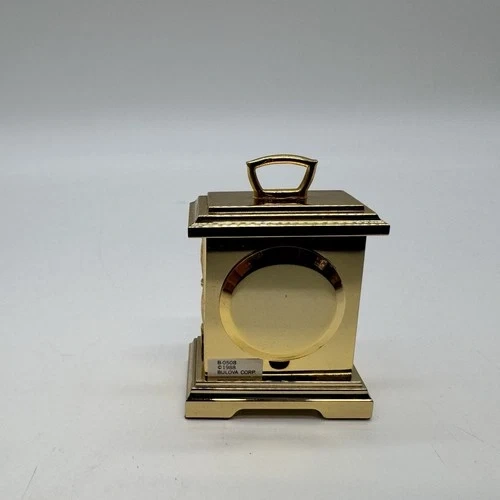 This is a beautiful vintage Bulova mini carriage clock, dated 1988 and made in Japan. It features a classic gold-tone carriage design with green decorative panels, Roman numeral dial, and a moonphase-style upper display. Compact, elegant, and perfect for collectors or desk décor.