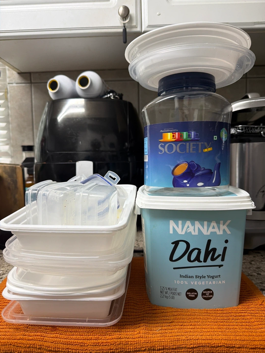Includes a Nanak Dahi Indian Style Yogurt container and a Society brand yogurt jar. Also comes with a stack of empty plastic food storage containers with lids. Good for storing leftovers or organizing small items.