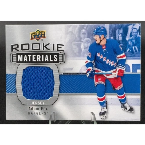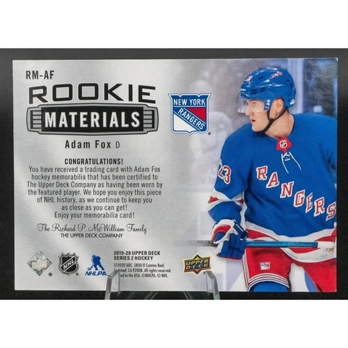 This is a 2019-2020 Upper Deck Series 2 Rookie Materials card featuring Adam Fox, #RM-AF. The card is shipped in a penny sleeve and top-loader. Let me know if you're interested!