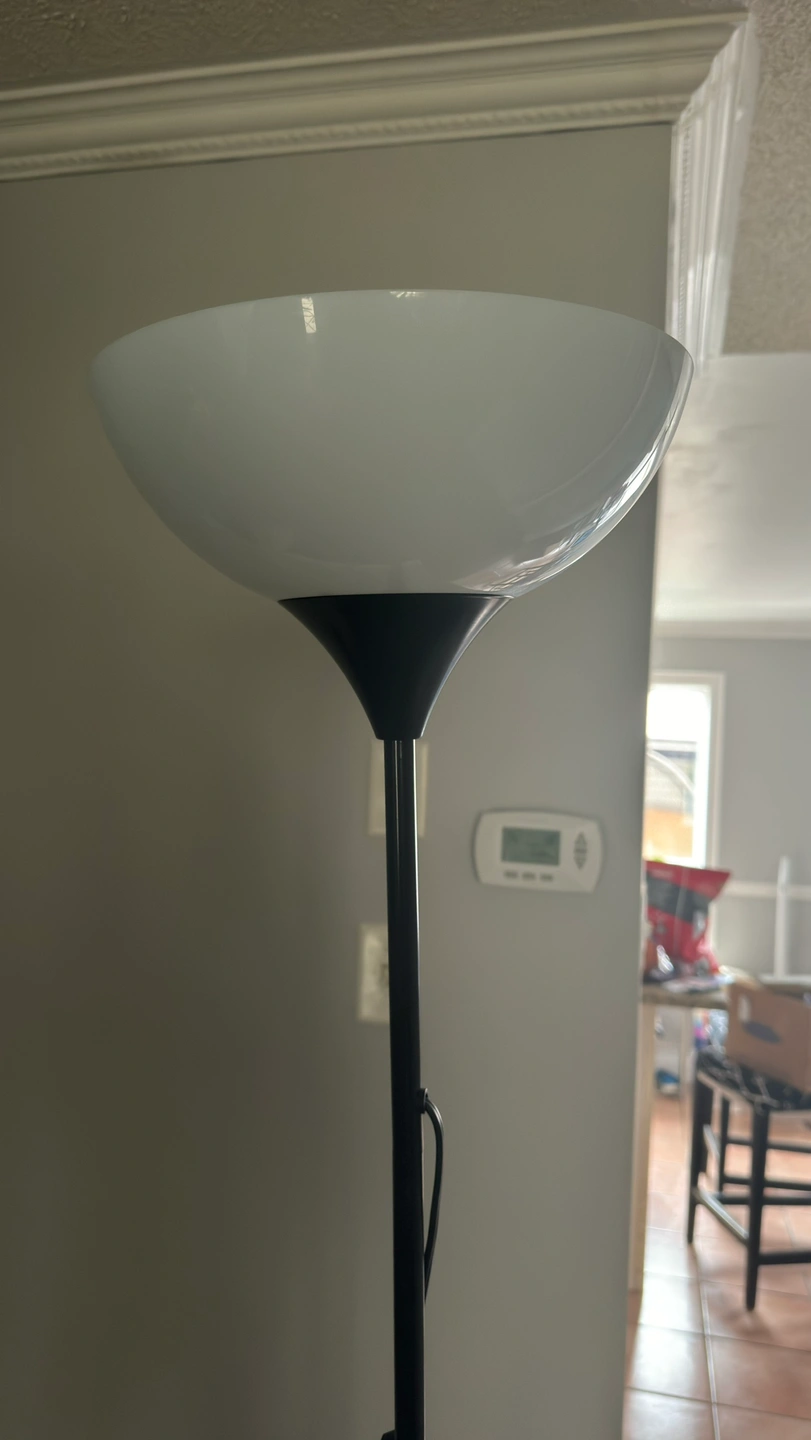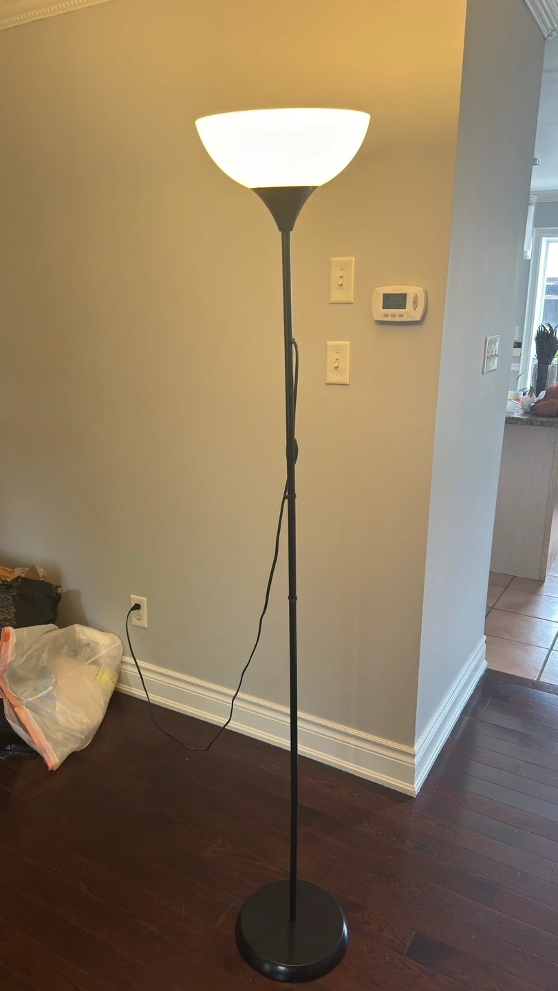 A basic black floor lamp with a white shade. This lamp has an on/off switch on the cord. It is approximately 5 feet tall. Pick up only. I have 3 of them. It’s $10 each.