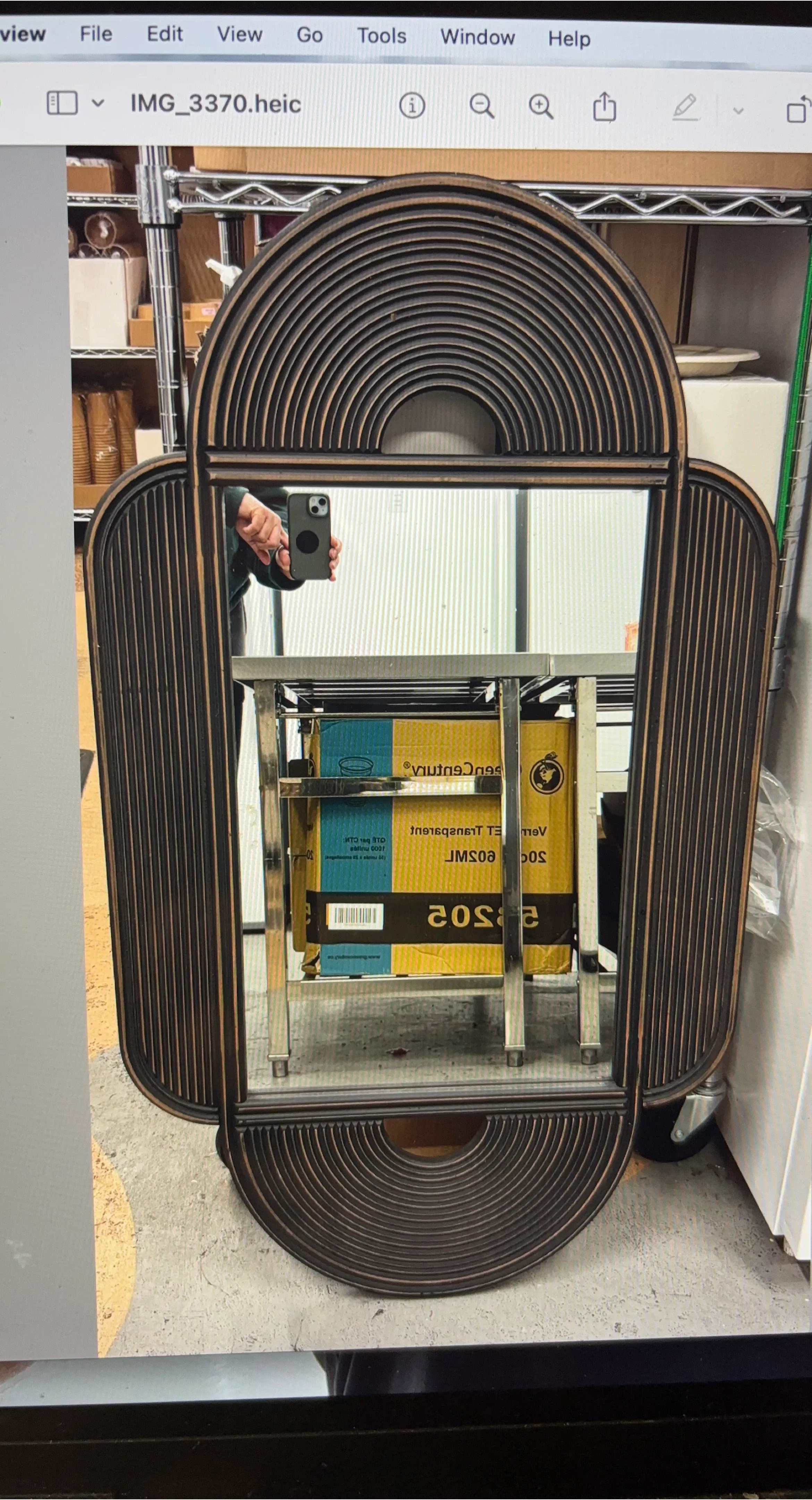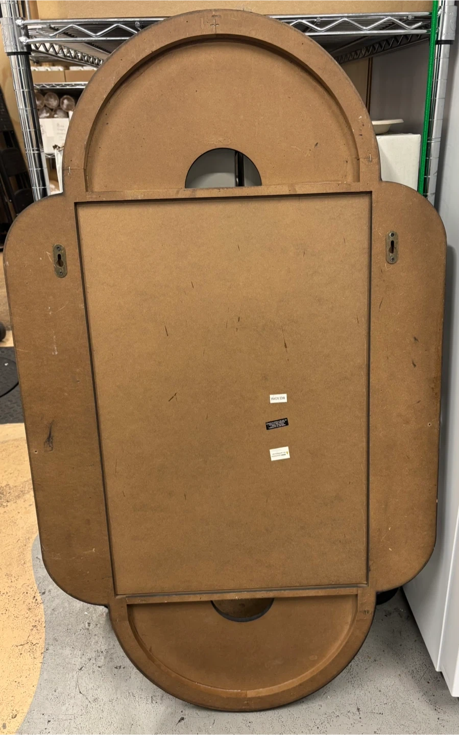 Decorative mirror with a unique shape. Features a dark brown finish and a central reflective surface. Ready for wall mounting.