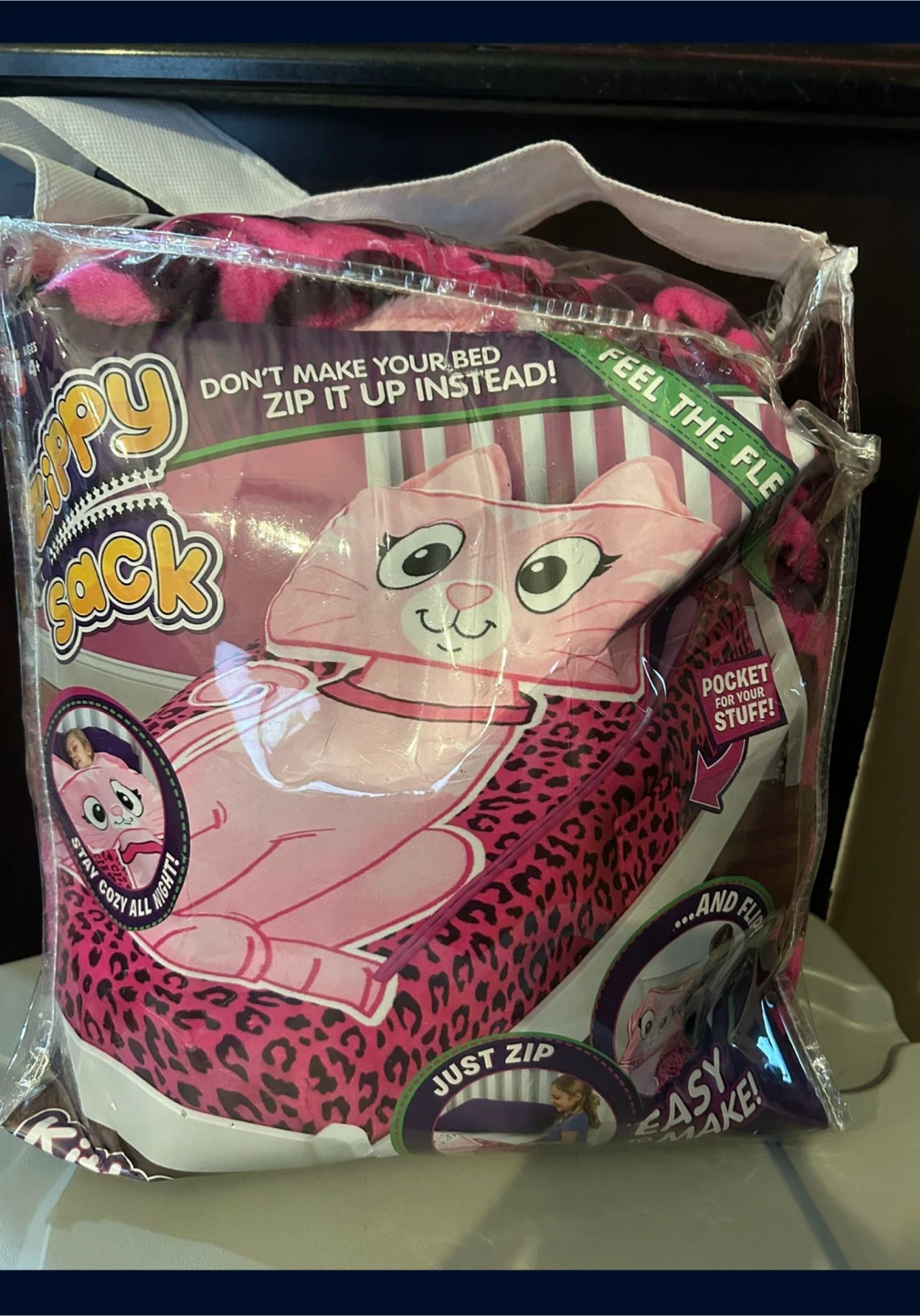 Get ready to zip up bedtime with this Zippy Sack! It's a fun and easy way for kids to make their beds. The packaging shows a cute cat design in pink and leopard print. Stay cozy all night!