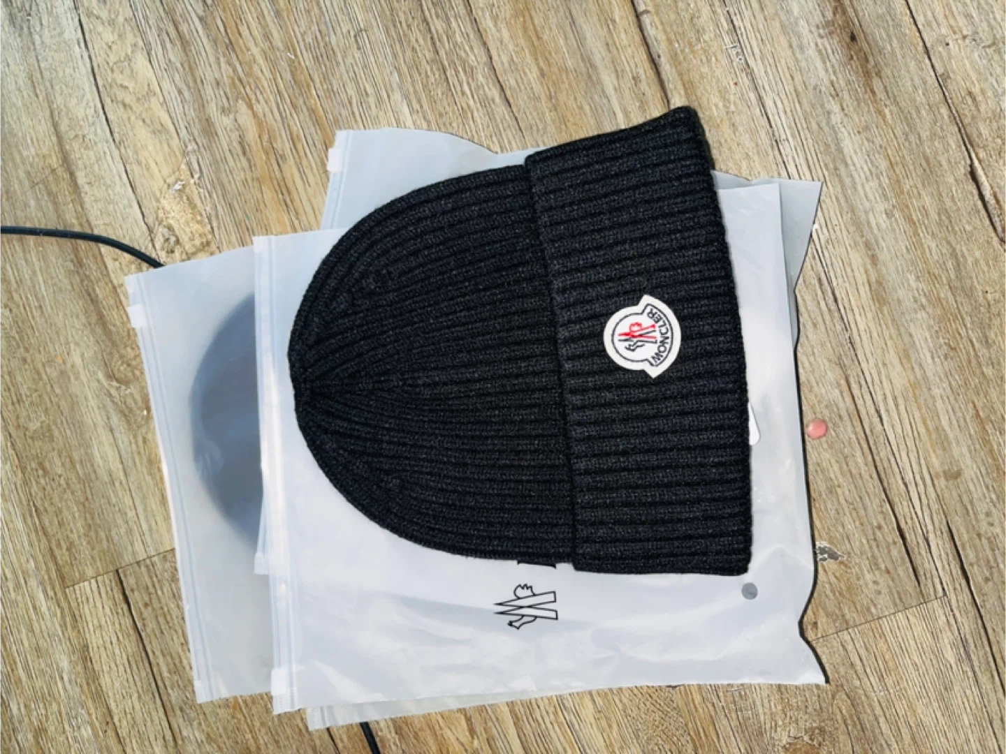 This is a black ribbed knit beanie from Moncler. It features the iconic Moncler logo patch. Comes with dust bags and tags.