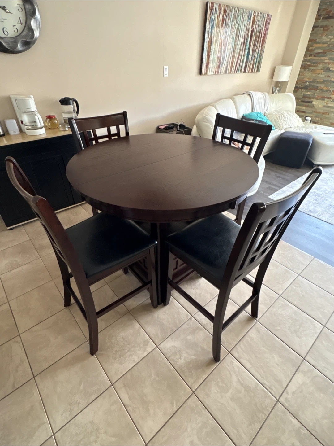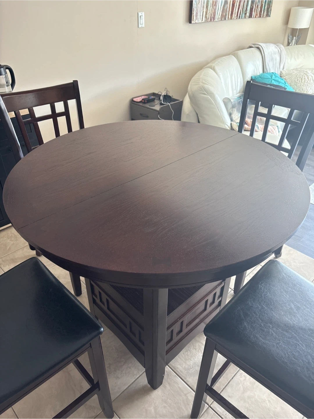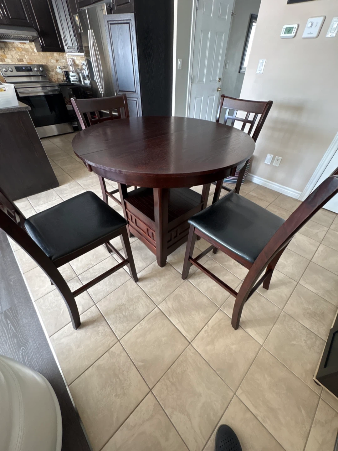 This dining set includes a round, dark wood table and four chairs with black faux leather seats. The table has a convenient shelf underneath. Chairs are comfortable for seating.