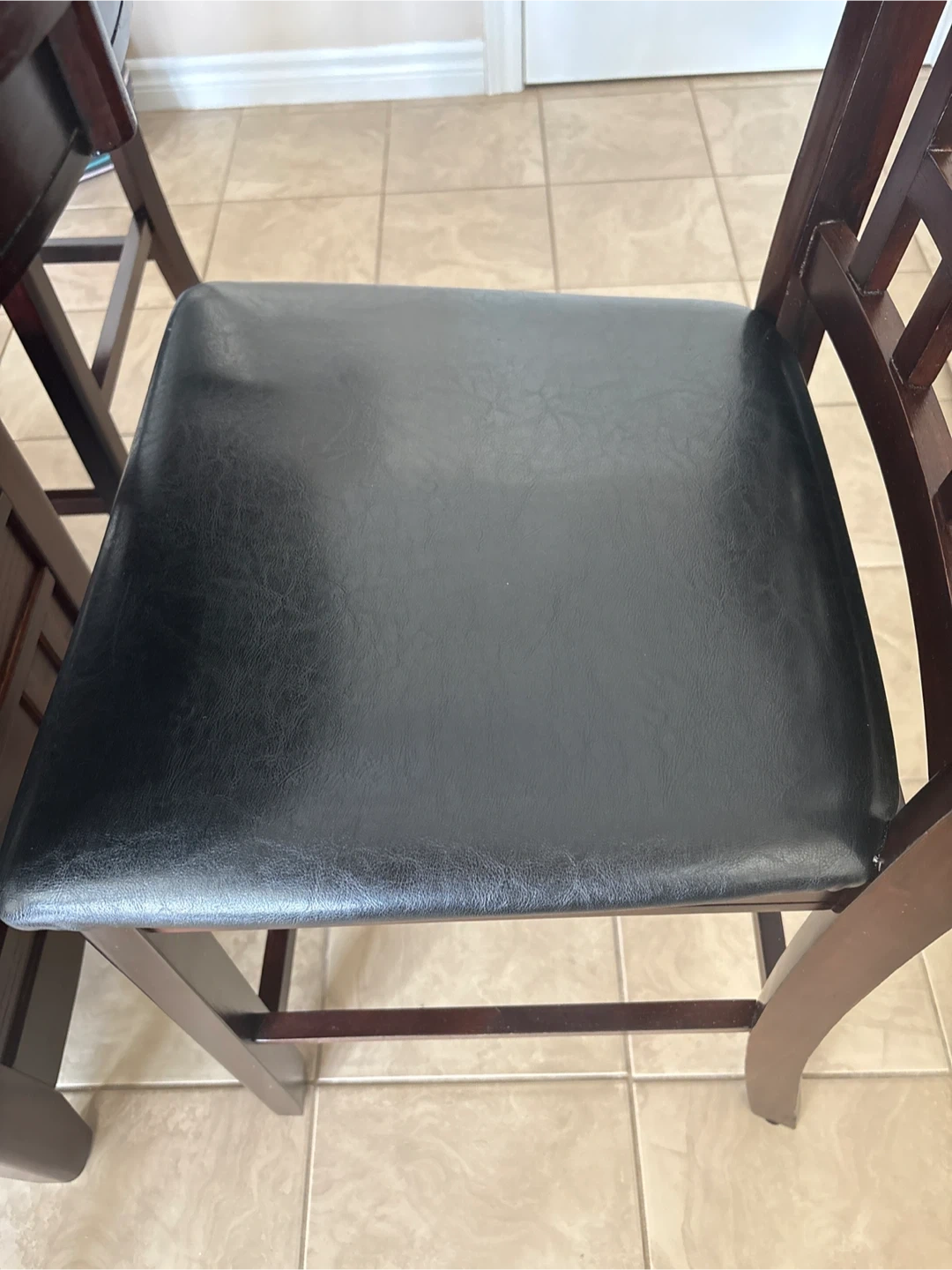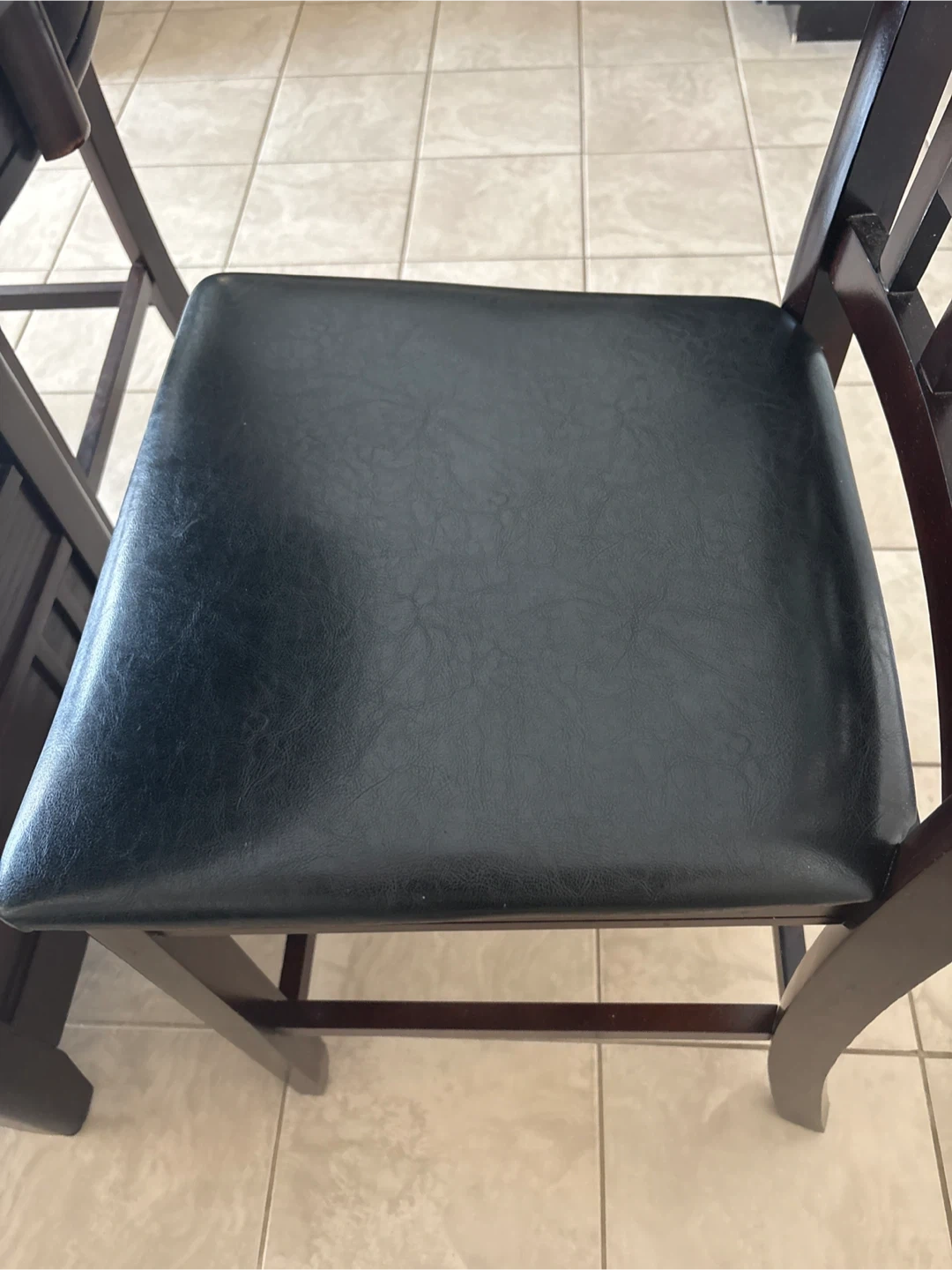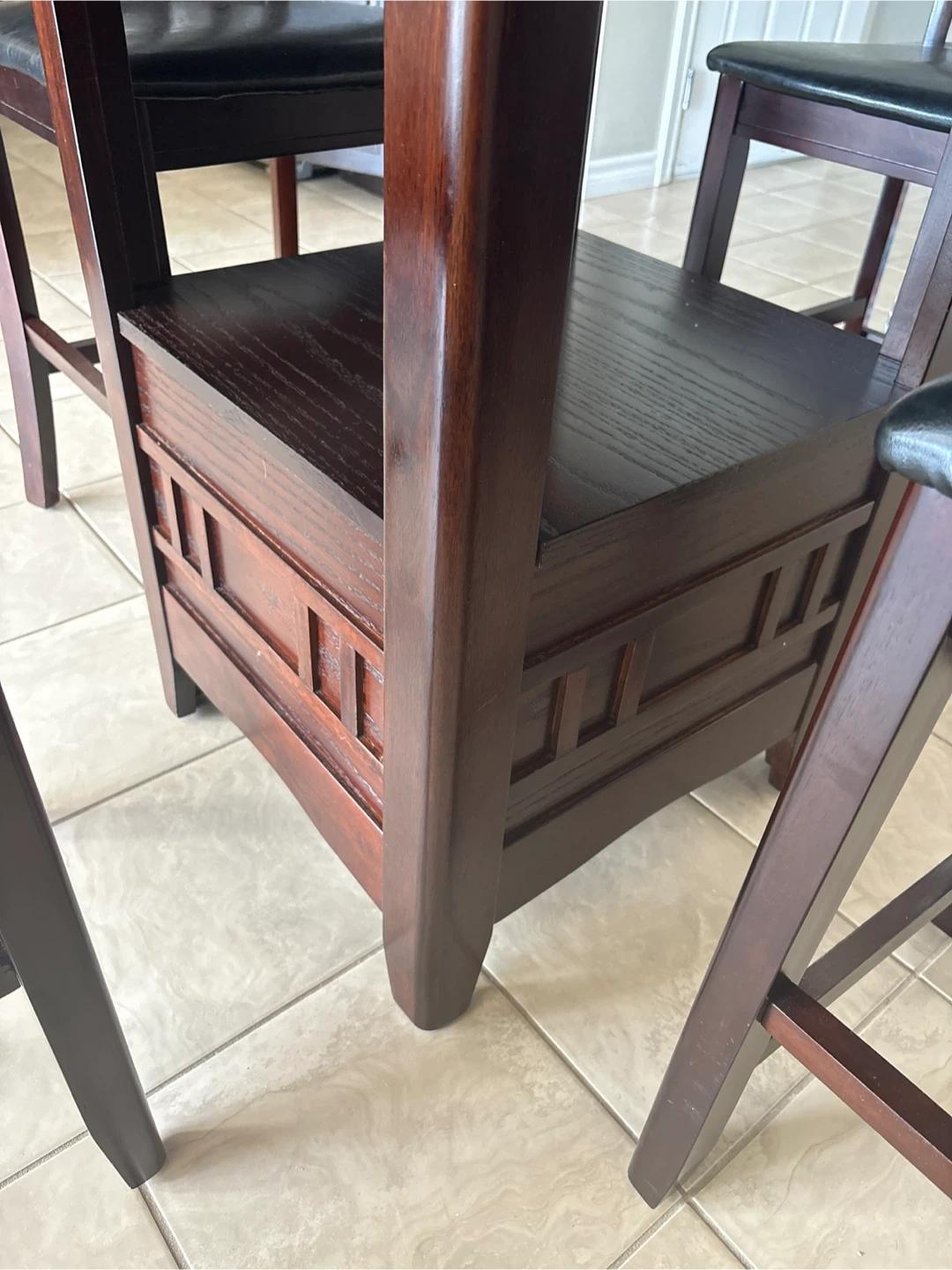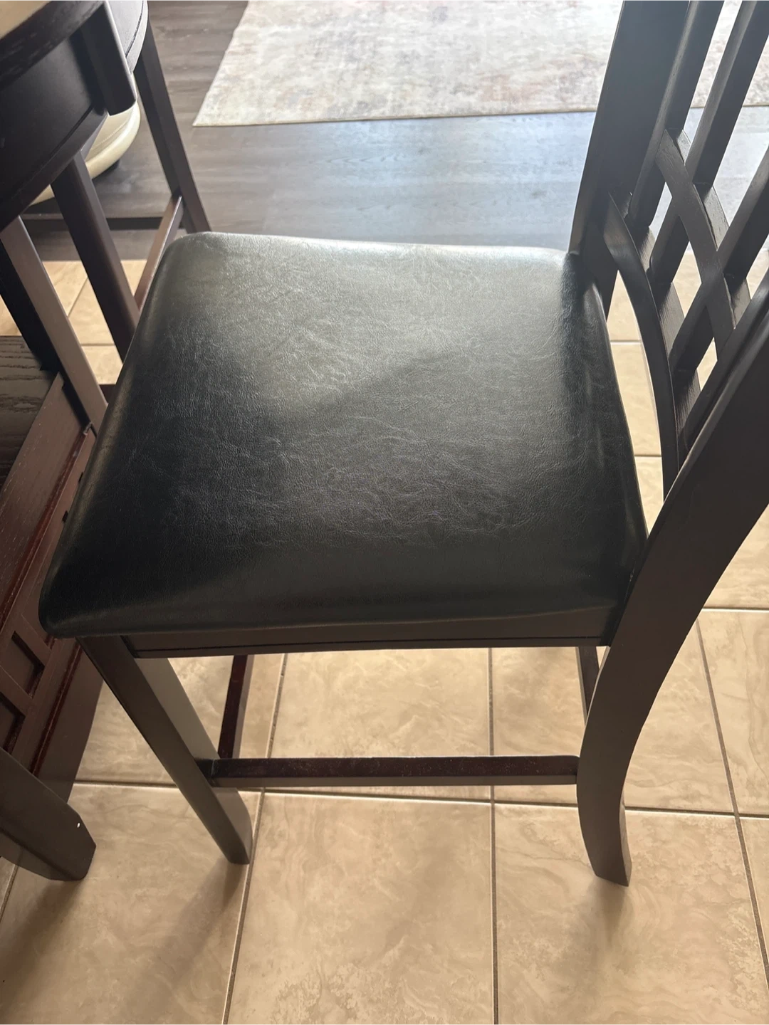 This dining set includes a round, dark wood table and four chairs with black faux leather seats. The table has a convenient shelf underneath. Chairs are comfortable for seating.