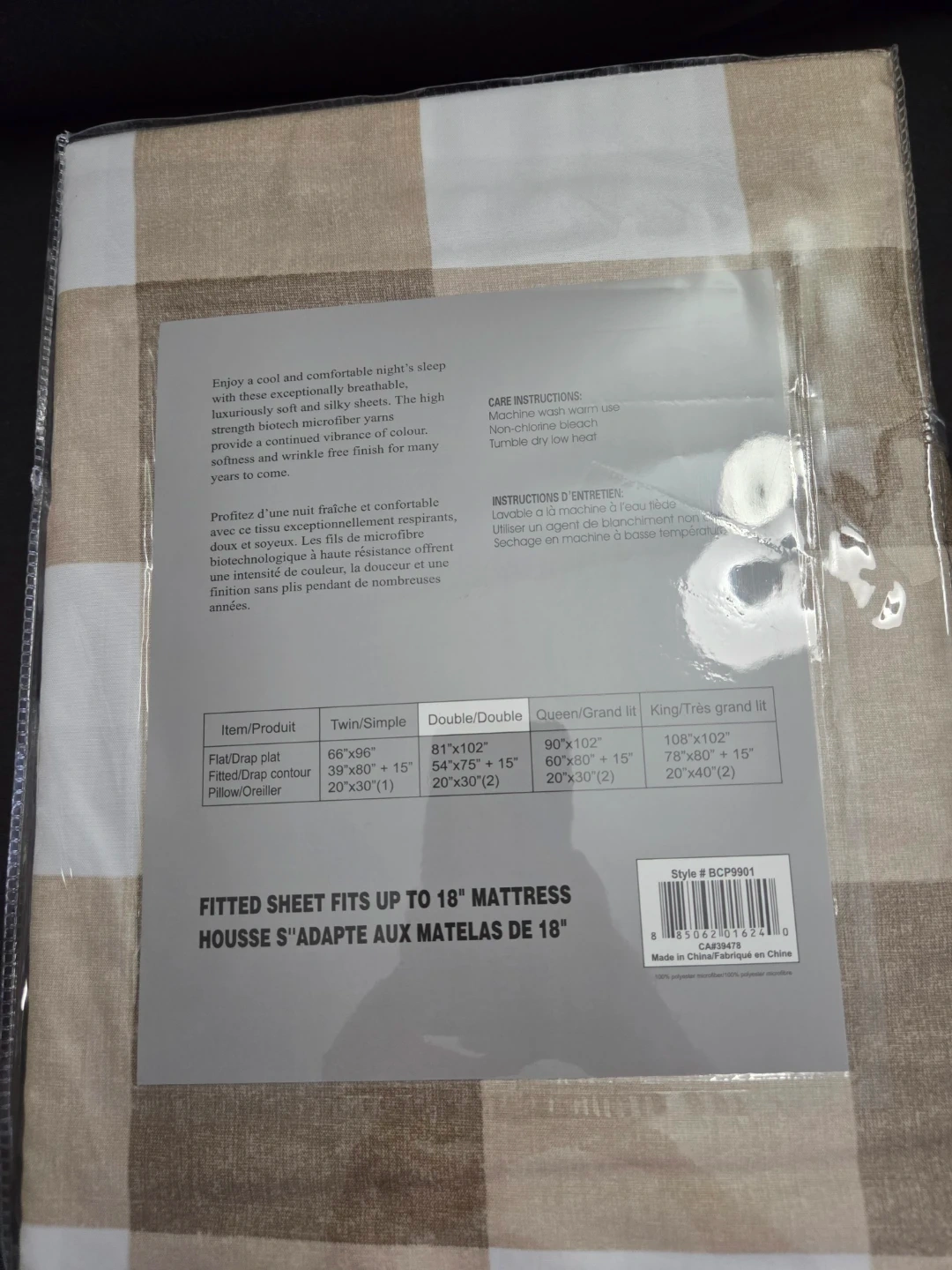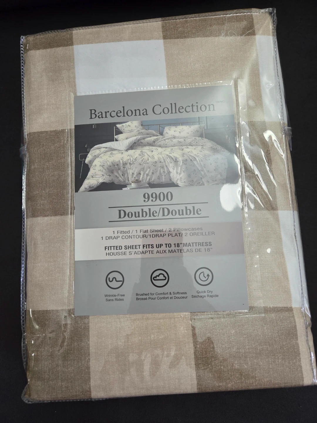 New in packaging, this Barcelona Collection bedsheet set is a double/double size. It includes one fitted sheet, one flat sheet, and two pillowcases. The fitted sheet fits mattresses up to 18" deep. It's wrinkle-free, brushed for comfort, and quick-drying!