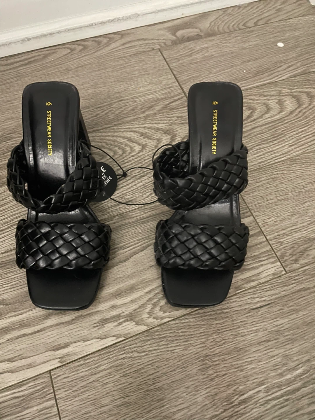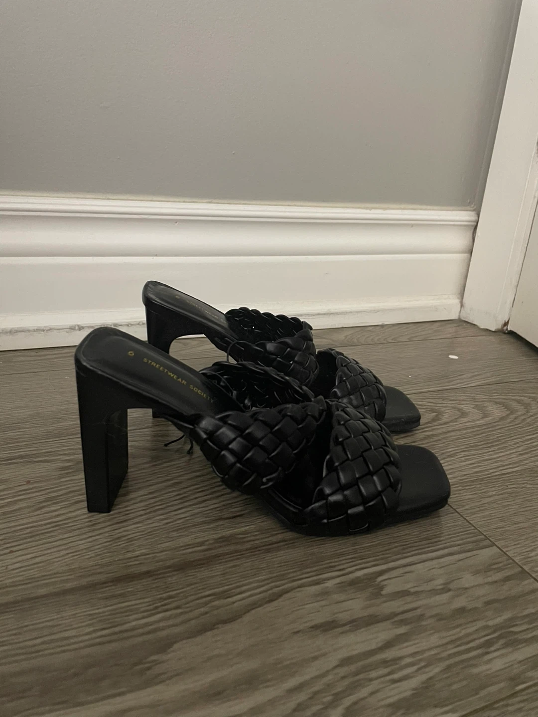 These black heeled mules from Streetwear Society feature a stylish woven design across the vamp. They have a square toe and a chunky block heel, making them a fashionable choice. The slip-on style offers easy wear. Cash only. Pick up only.