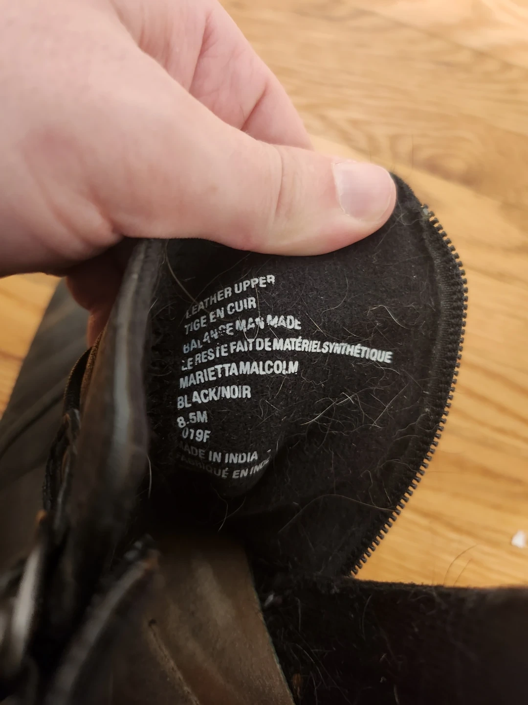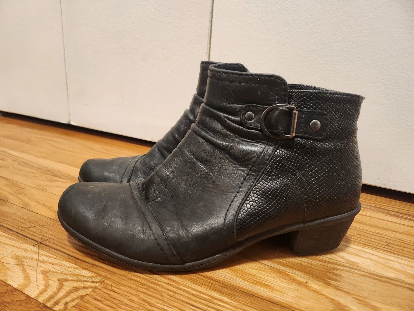 Black leather ankle boots from Marietta Malcom. These boots feature a side zipper for easy wear and a decorative buckle detail. Genuine leather upper and balance man-made. Size 8.5.