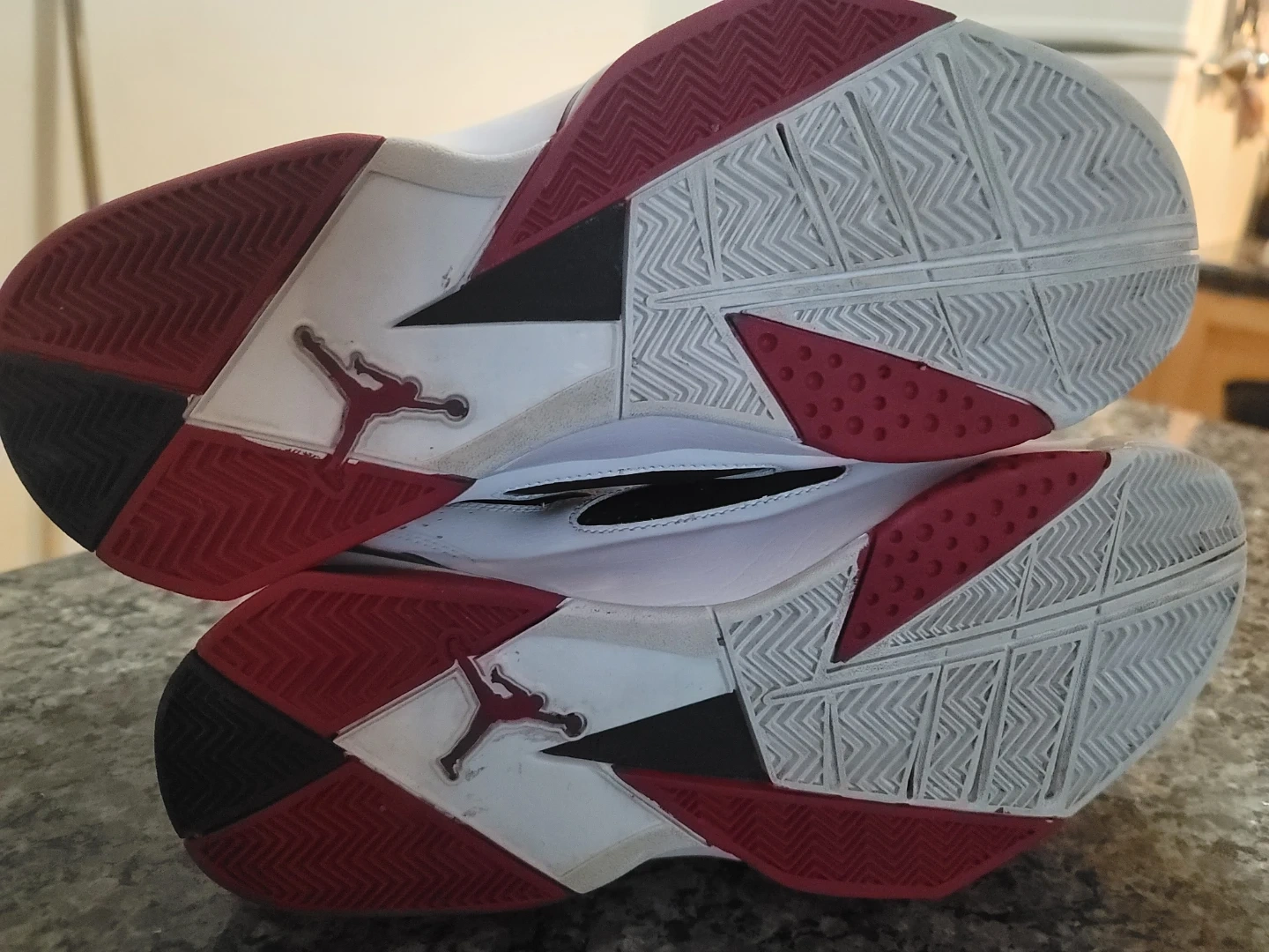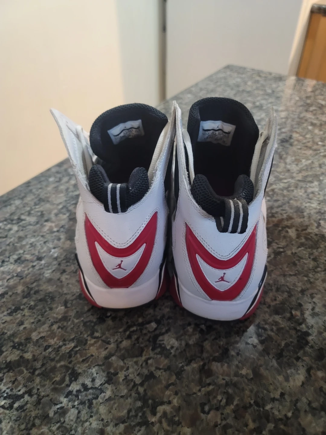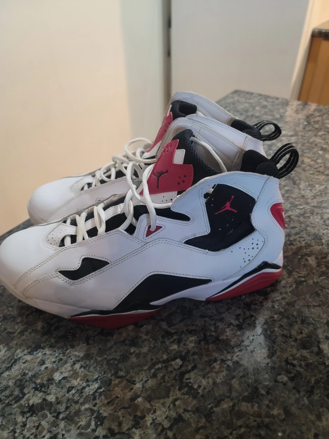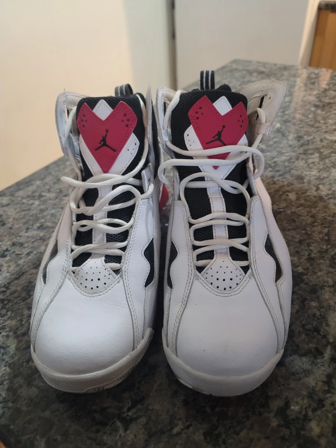 White, black, and red Air Jordan True Flight sneakers. High-top basketball shoes. Leather and synthetic materials. Size 11.5. LIke new. P/U only.