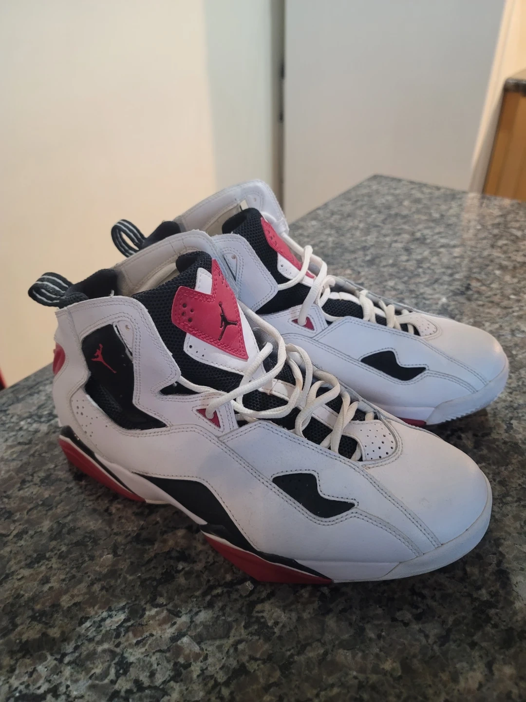 White, black, and red Air Jordan True Flight sneakers. High-top basketball shoes. Leather and synthetic materials. Size 11.5. LIke new. P/U only.