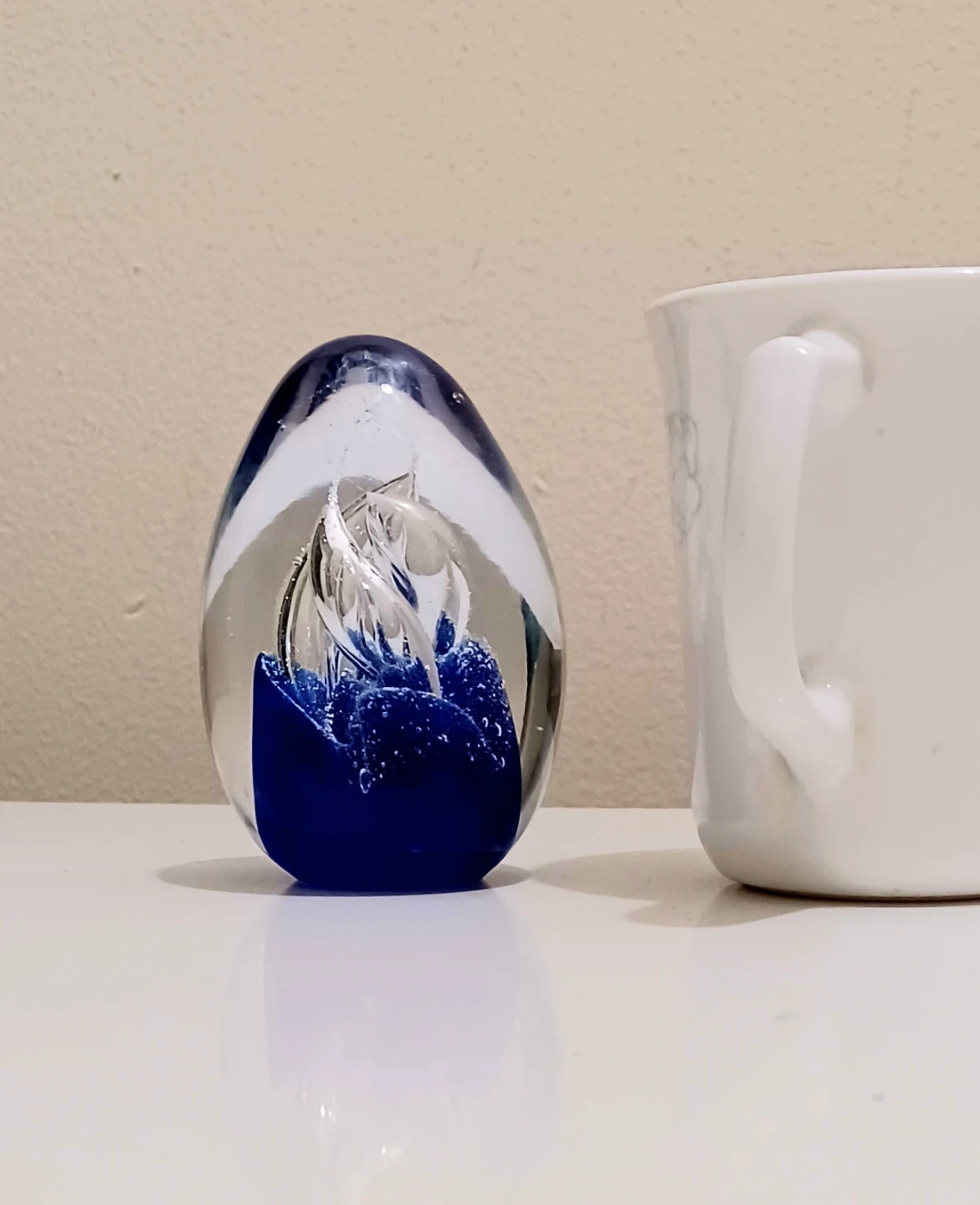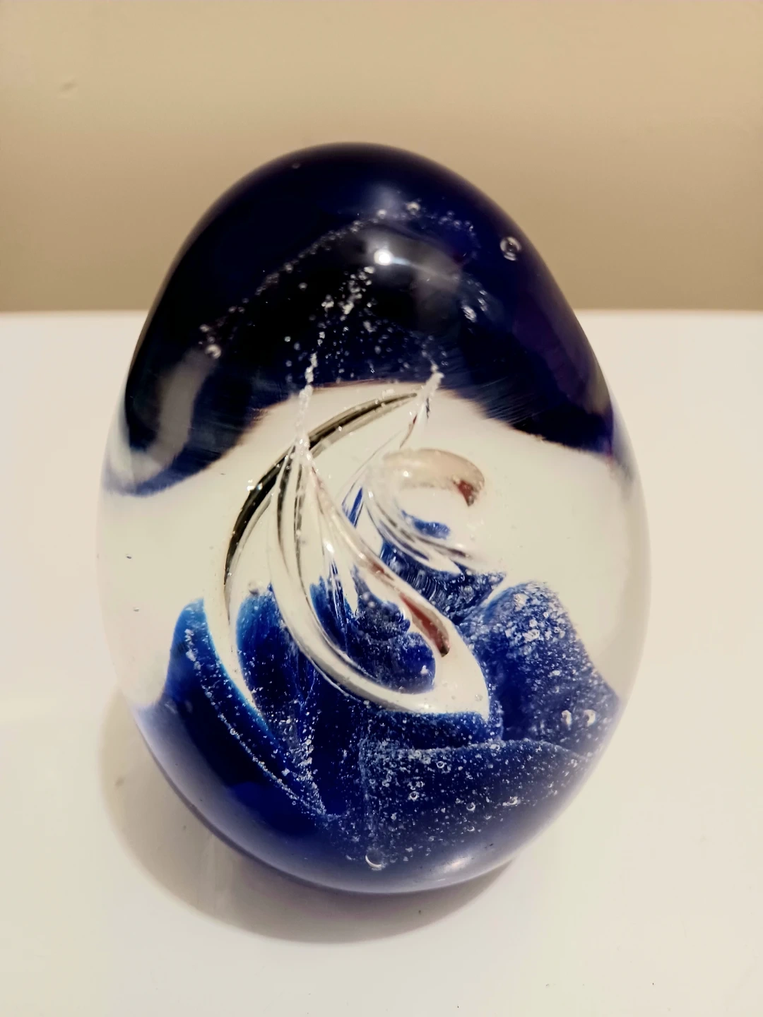 Add a touch of elegance to your desk with this beautiful, Hand Blown glass paperweight featuring a Controlled Bubbles striking Cobalt Blue and clear design with a delicate white Swirl encased within.