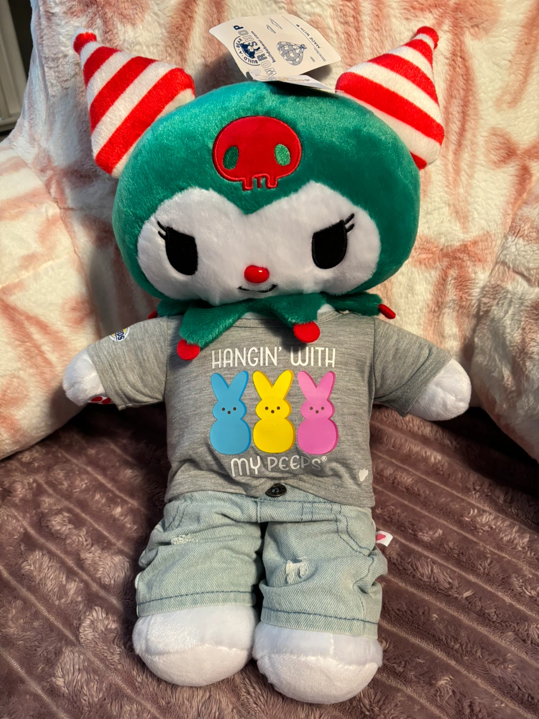 Sanrio Kuromi, one NEW Build-a-Bear Kuromi dressed in a grey t-shirt and denim jeans. The t-shirt says "Hangin' with My Peeps" and features Peeps candy characters. Also includes a purple Kuromi plush bag (not Build-a-Bear).