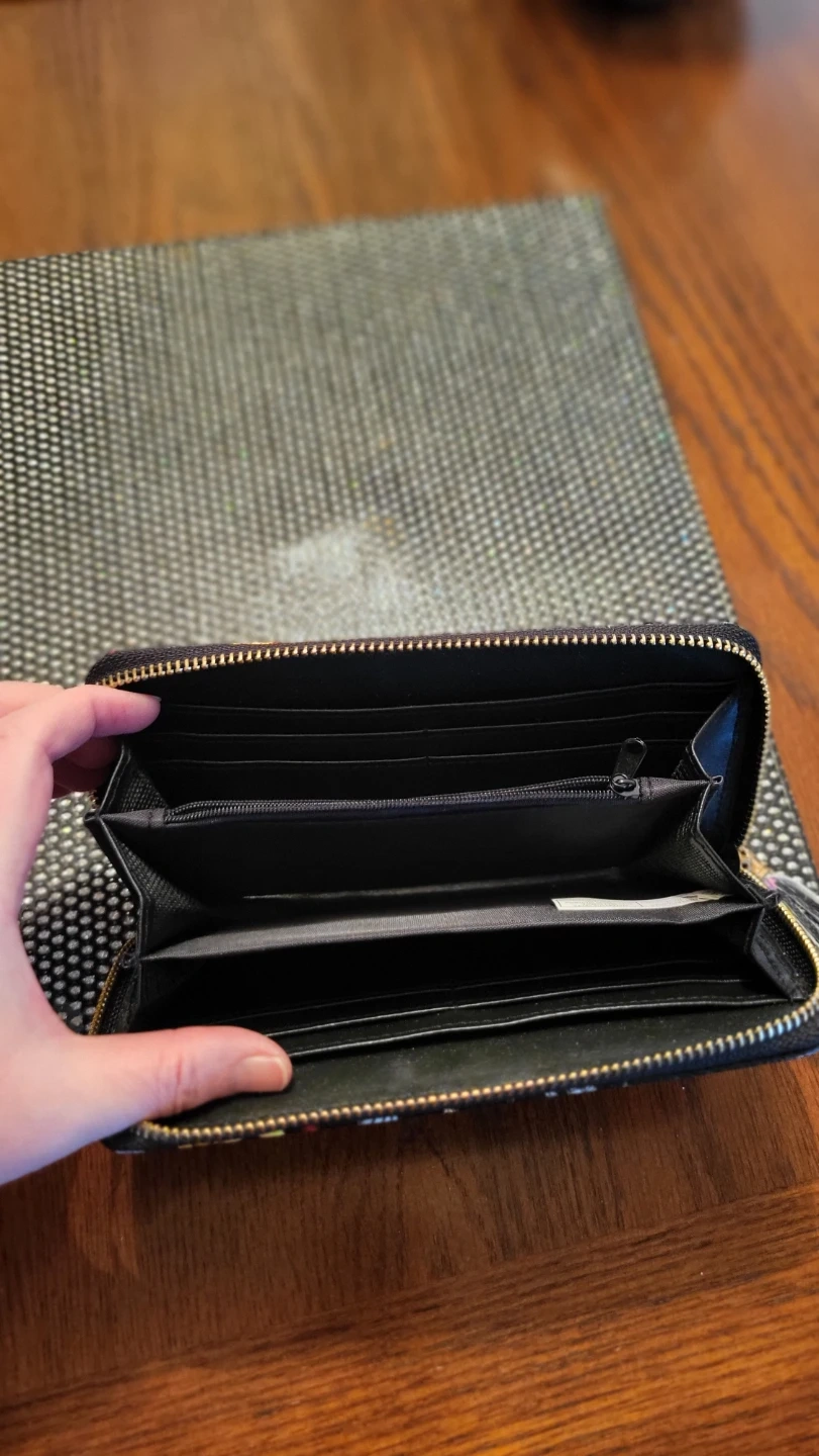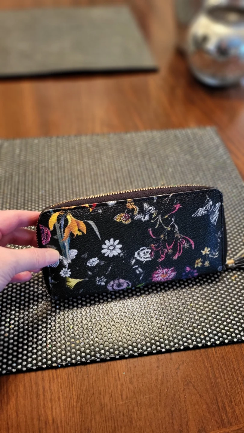 This leather zip-around wallet features a black background with a colourful floral and butterfly print. It has multiple card slots and a zippered coin pocket inside. It's a convenient accessory for keeping your essentials organized.