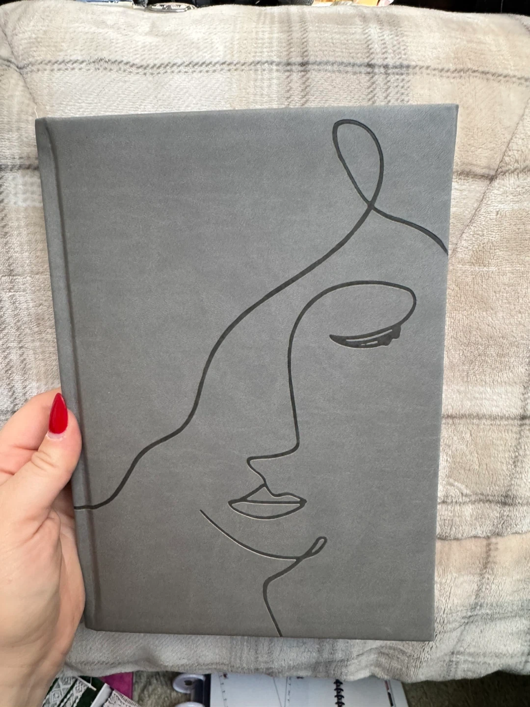 A grey notebook featuring a minimalist abstract face design on the cover. It's a hardcover journal, perfect for jotting down notes or ideas. Its neutral colour makes it a stylish accessory.