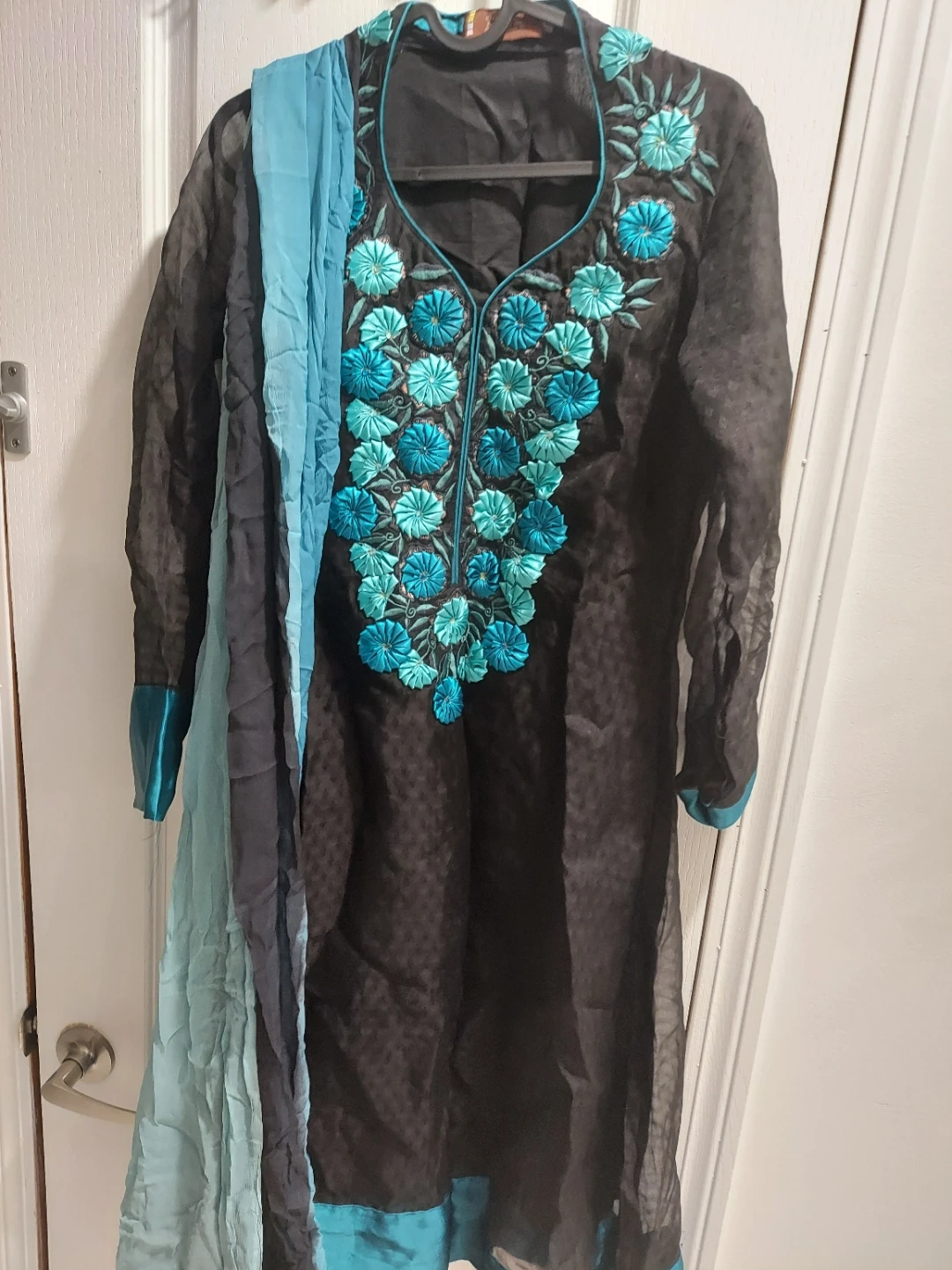 Black kurti with a V-neckline featuring intricate blue and teal floral embroidery. It comes with a matching blue scarf. The fabric appears to be a lightweight, textured material. This outfit is great for casual or semi-formal occasions.
