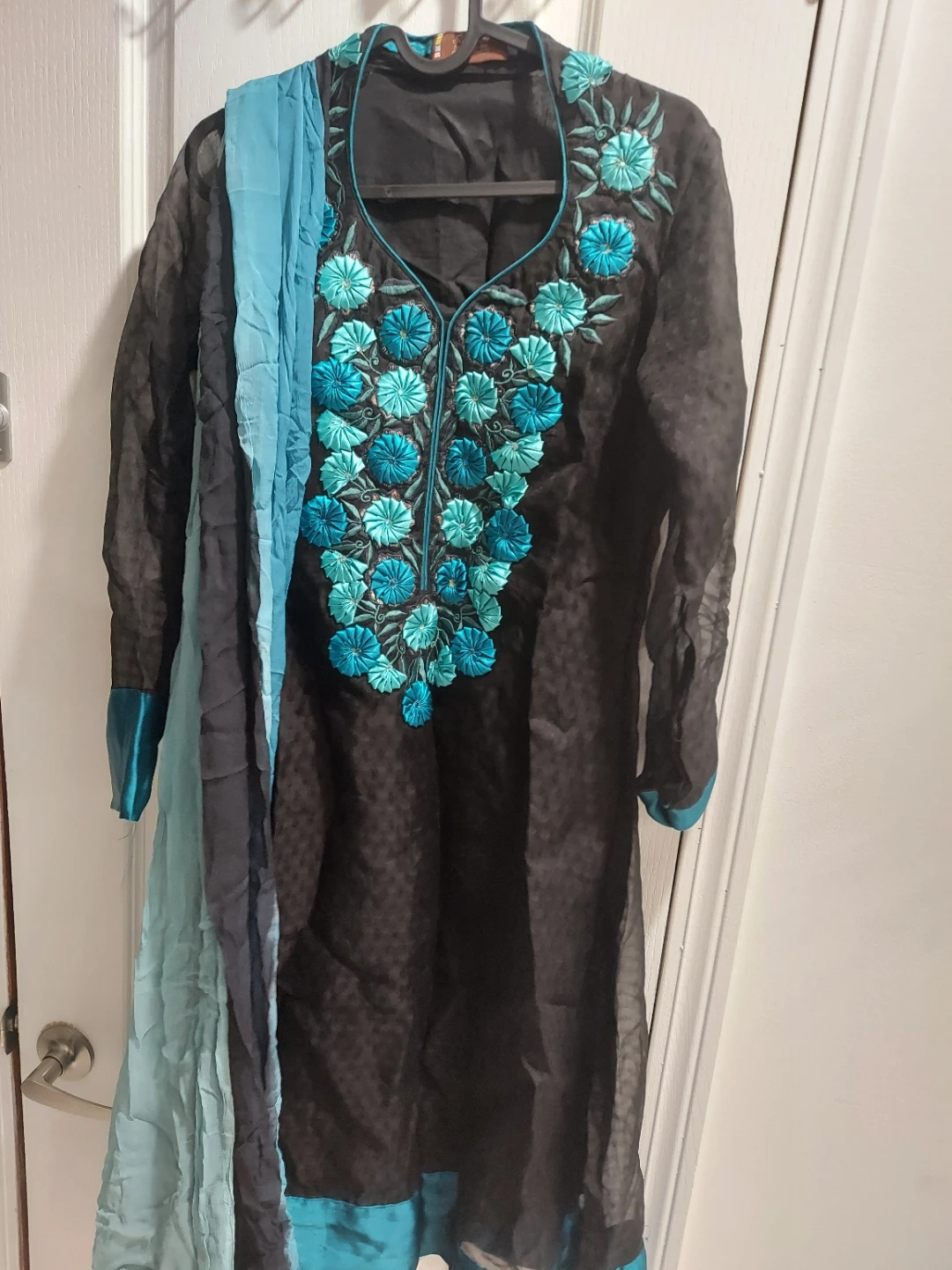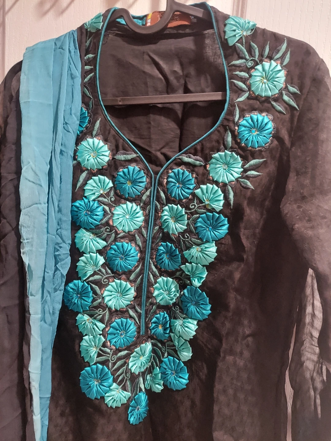 Black kurti with a V-neckline featuring intricate blue and teal floral embroidery. It comes with a matching blue scarf. The fabric appears to be a lightweight, textured material. This outfit is great for casual or semi-formal occasions.