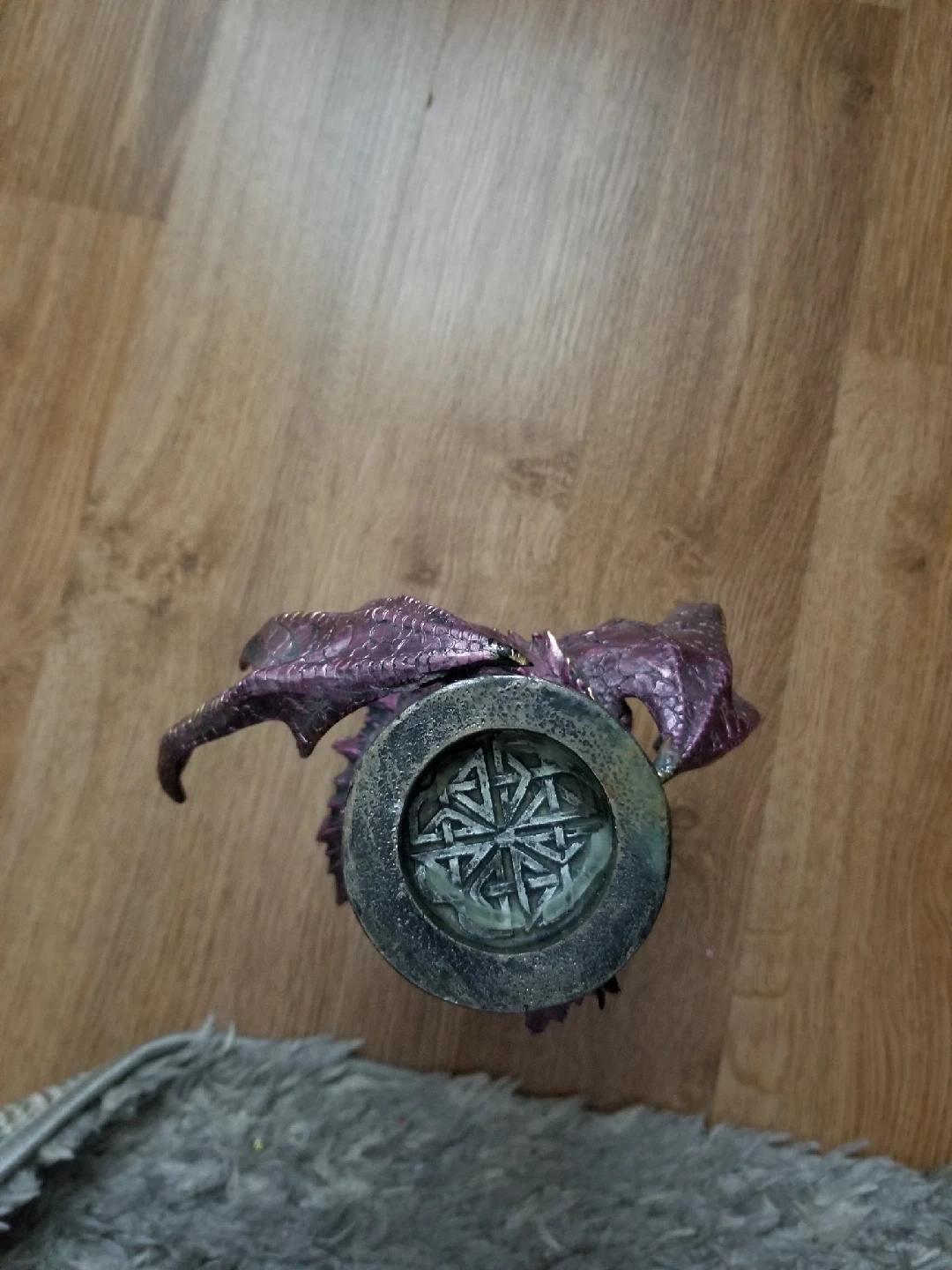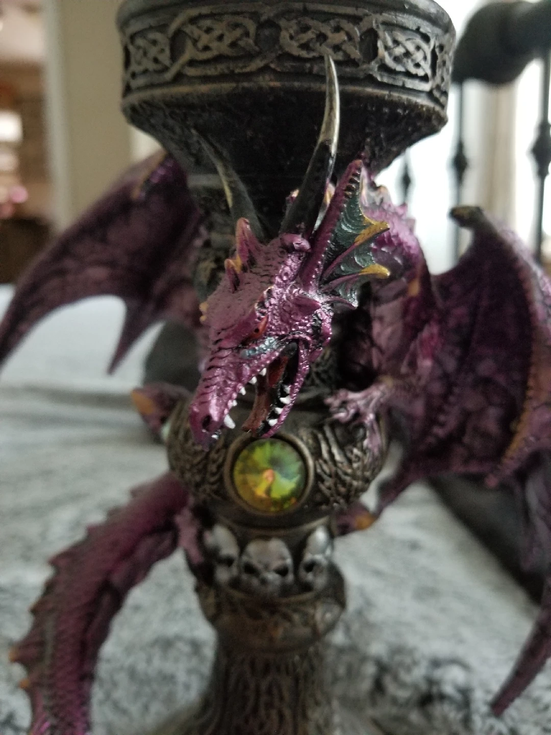 10This is a cool dragon figurine that doubles as a candle holder! It's purple and has a unique design with skulls around the base. It's in great condition and would look awesome on a shelf or as a centrepiece