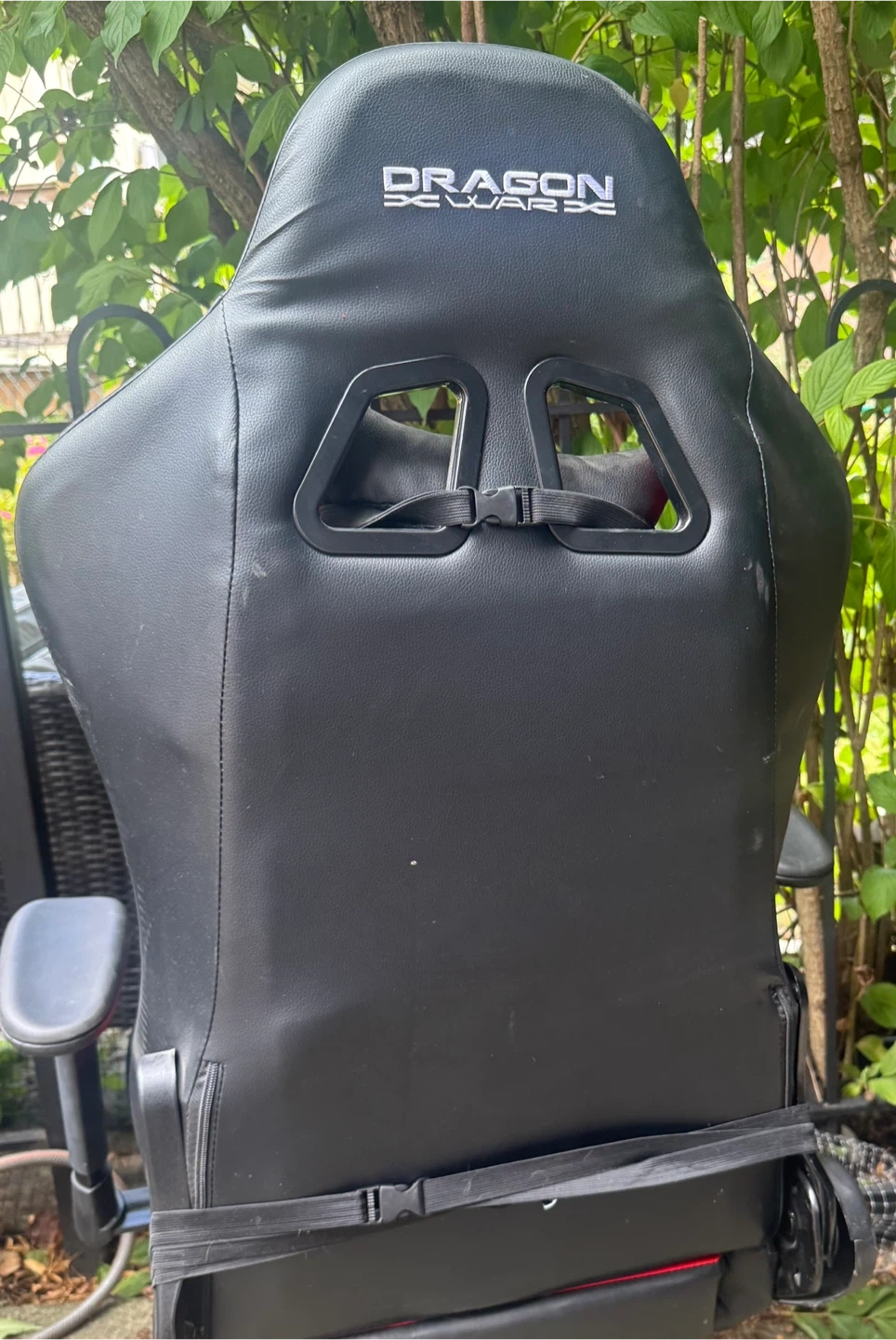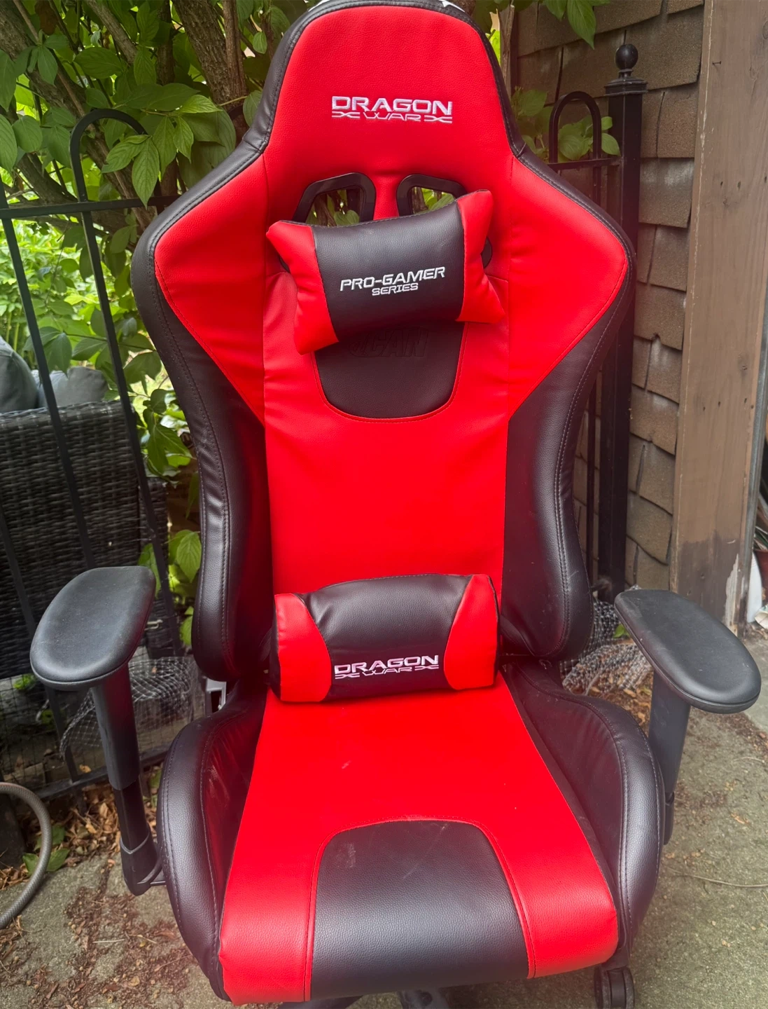 Looking to sell a Dragon X-Warxe Pro-Gamer Series gaming chair! It's in good condition and ready for a new home. It features a red and black design with adjustable armrests and comfortable padding for those long gaming sessions. The chair also has a headrest and lumbar support for added comfort