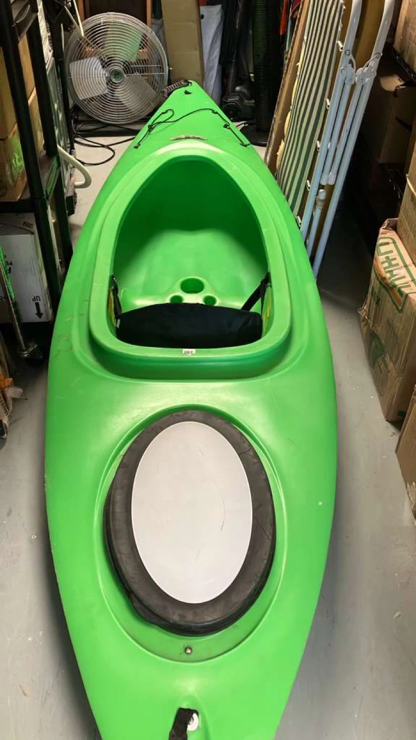 This is a single-person kayak. It's lime green and made of durable plastic. Features a seat and a storage hatch. This kayak come with pedals 1 and New accessories: plastic bit holder and other accessories.