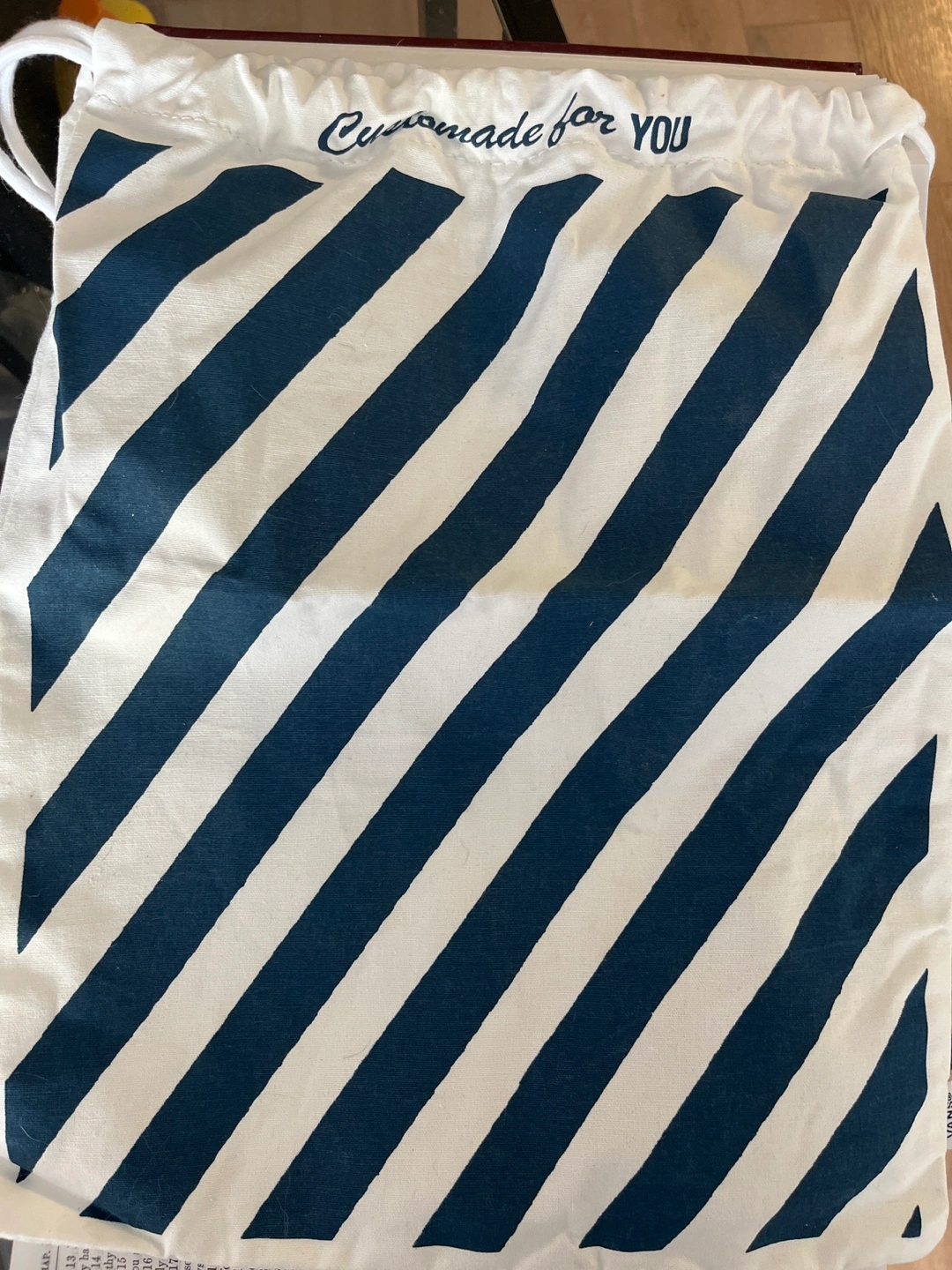 Says, “Custom Made For You “, Drawstring bag with diagonal stripes. The drawstring is white. A great item to help you stay organized or to present a gift for someone.