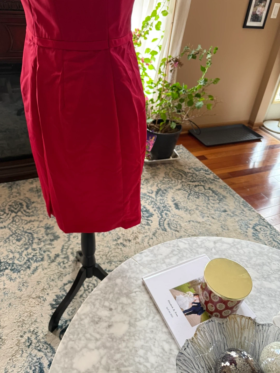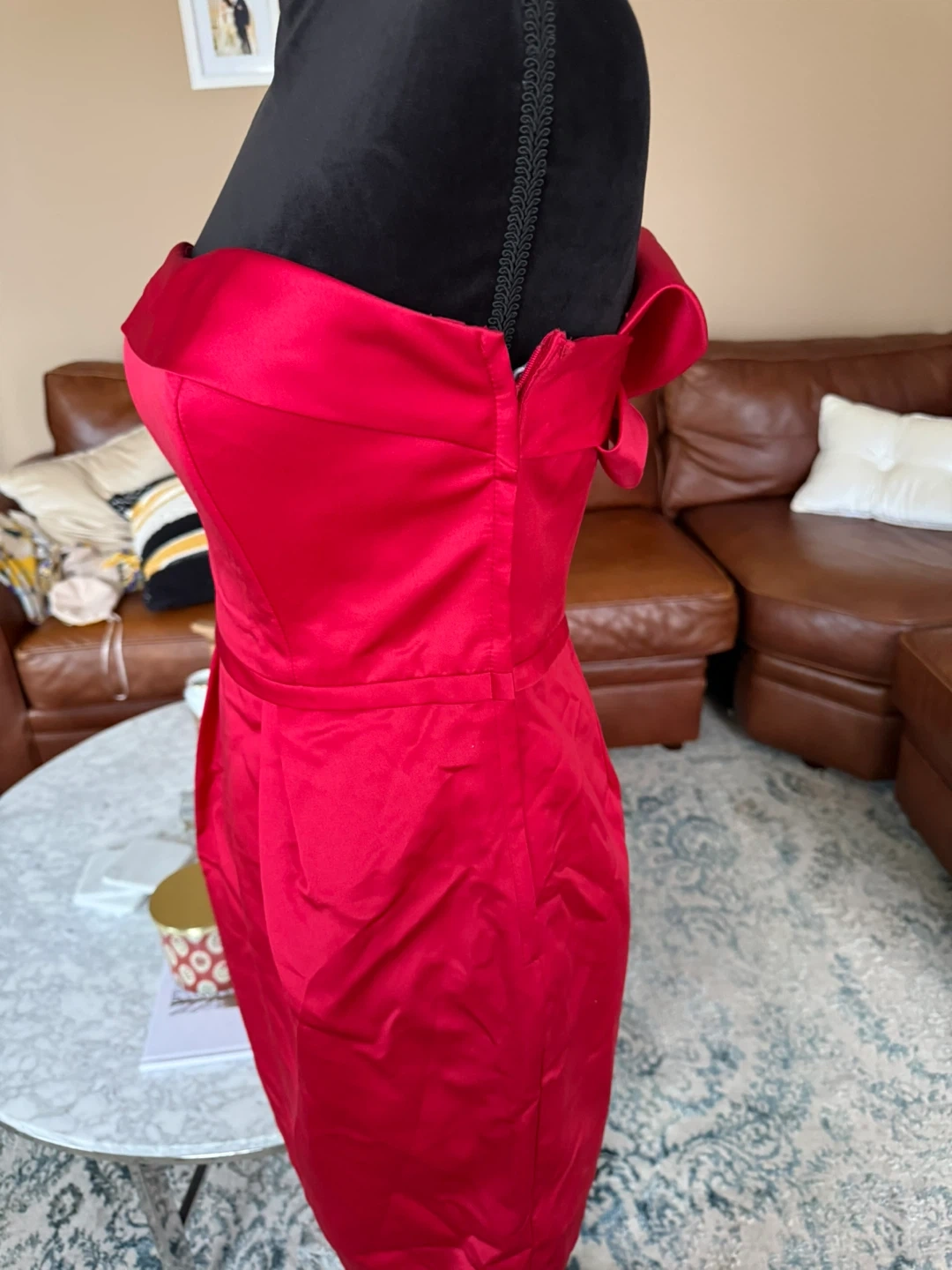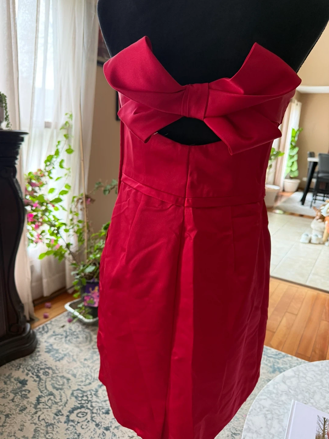 A lovely red strapless mini dress with a statement bow detail on the back. It's a classic silhouette perfect for special occasions. Zip closure. The product is a David's Bridal red sleeveless bridesmaid dress in size 8 regular. Made from 100% polyester, this dress features a flattering sleeveless style and is designed for special formal occasions like weddings. With its vibrant red color and reputable designer brand, this dress is sure to make a statement and stand out among the wedding party. Ideal for bridesmaids looking for a stylish and elegant dress to wear in a wedding or formal event. Take time to look my daily sales thank you !!