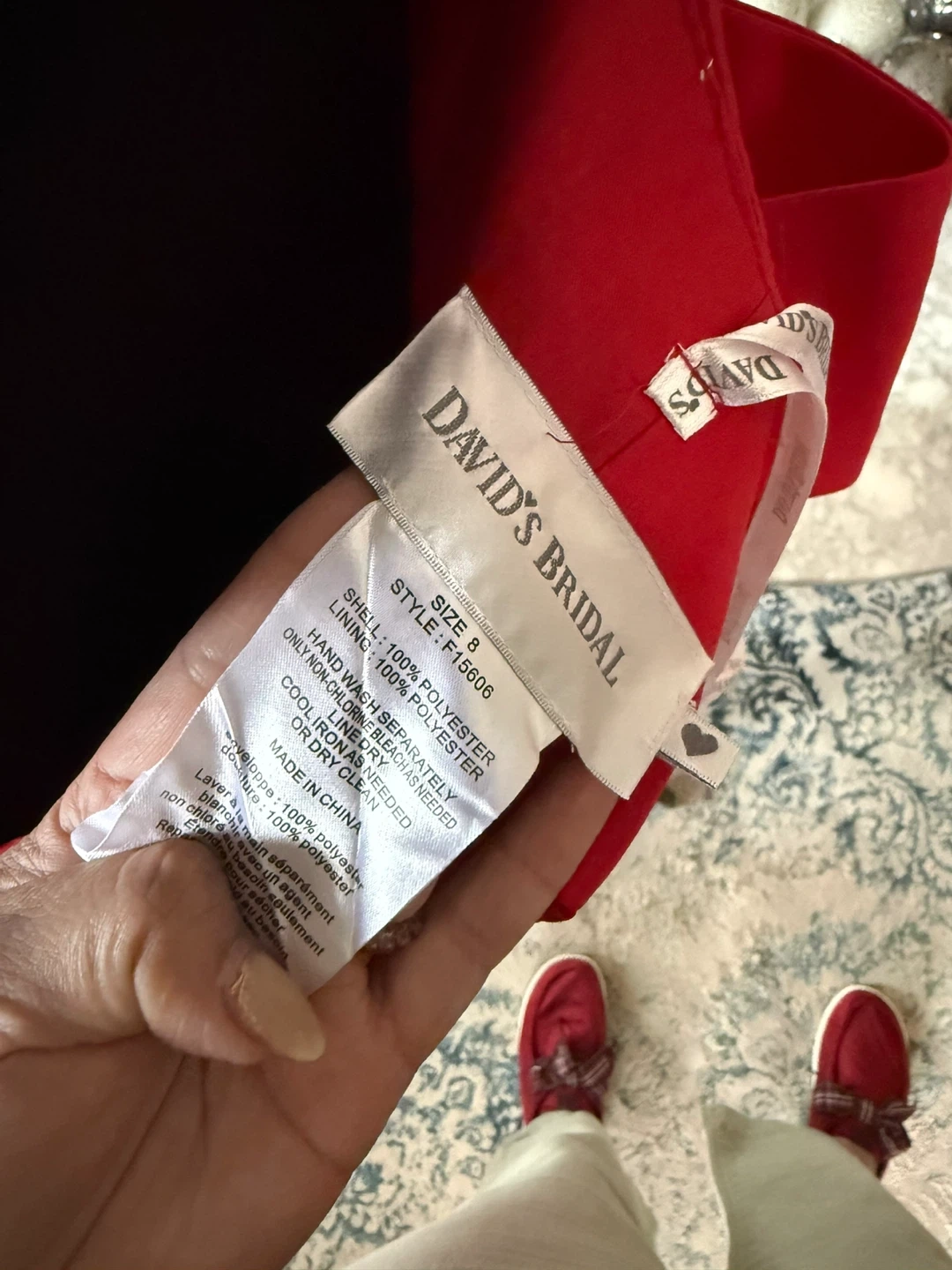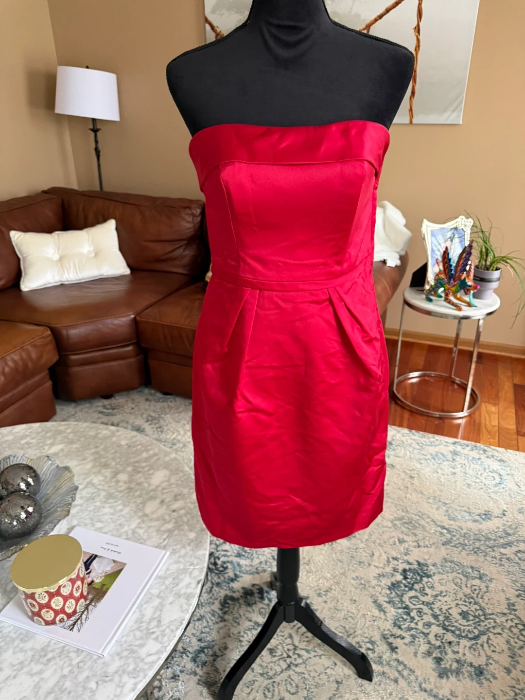 A lovely red strapless mini dress with a statement bow detail on the back. It's a classic silhouette perfect for special occasions. Zip closure. The product is a David's Bridal red sleeveless bridesmaid dress in size 8 regular. Made from 100% polyester, this dress features a flattering sleeveless style and is designed for special formal occasions like weddings. With its vibrant red color and reputable designer brand, this dress is sure to make a statement and stand out among the wedding party. Ideal for bridesmaids looking for a stylish and elegant dress to wear in a wedding or formal event. Take time to look my daily sales thank you !!