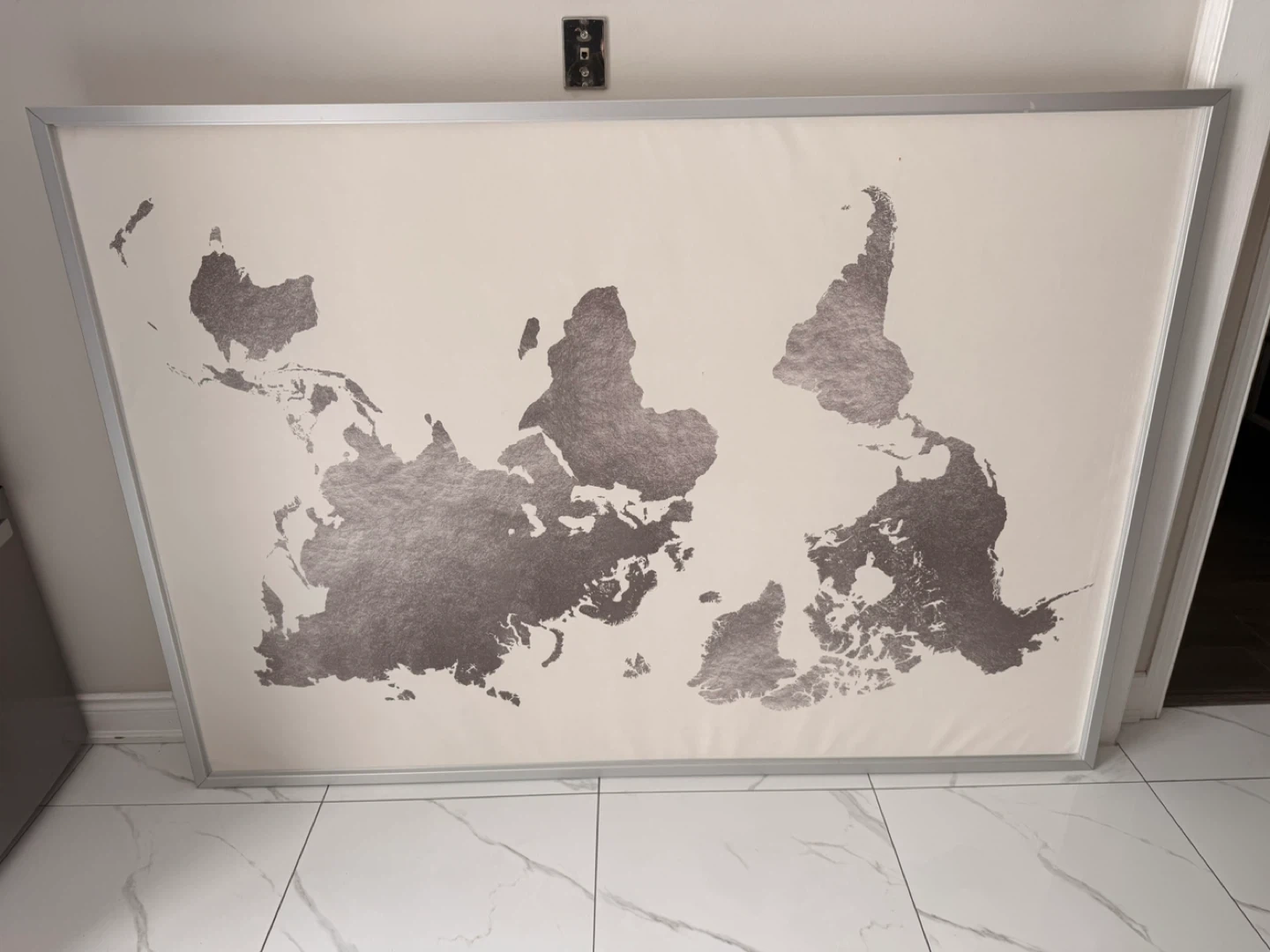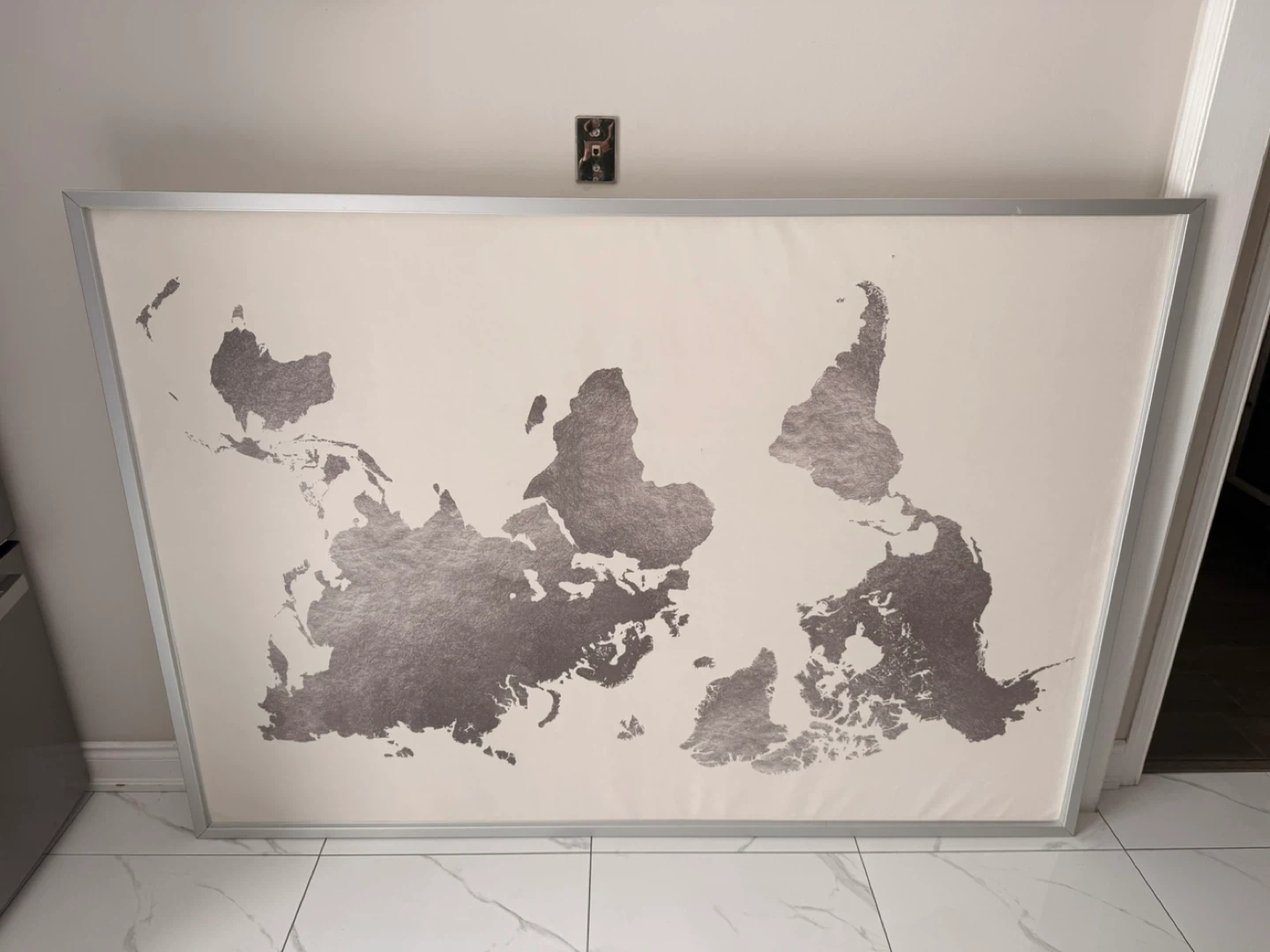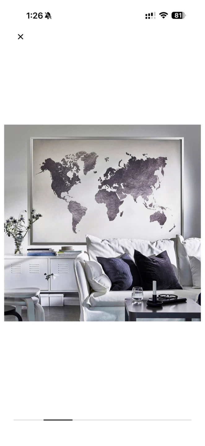 Selling a lovely world map wall art piece from IKEA. It features a silver-tone world map design on a light background, framed in a simple silver-tone frame. It's a great way to add a touch of global style to your home decor!