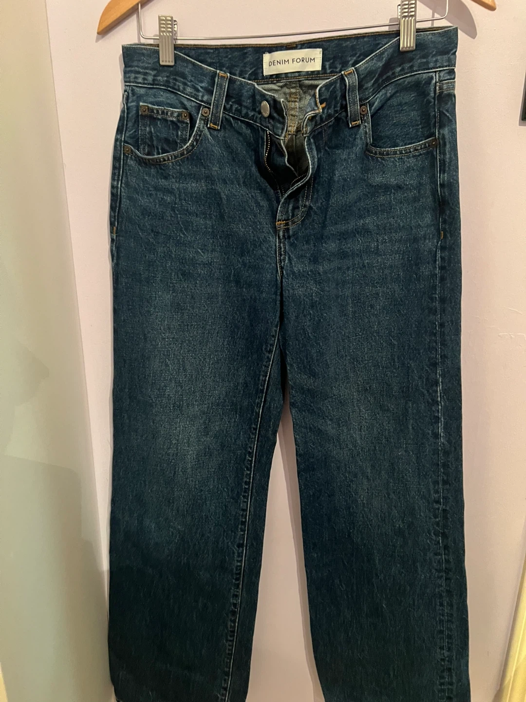 These are Denim Forum women's dark wash straight leg jeans. They're made from a cotton blend denim. The classic five-pocket styling and zip fly provide a timeless look.