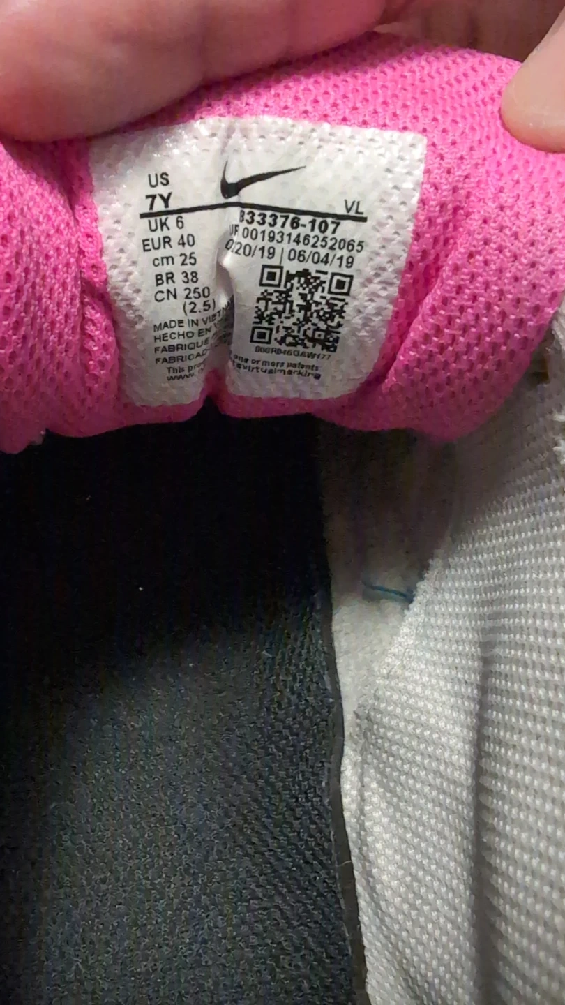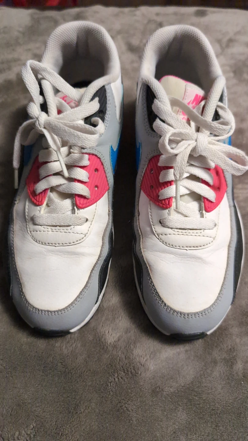 Youth Nike Air Max 90 sneakers in a white, grey, pink, and blue colourway. Size 7Y (US), 6K (UK), 40 EUR, 25 cm. Made in Vietnam.