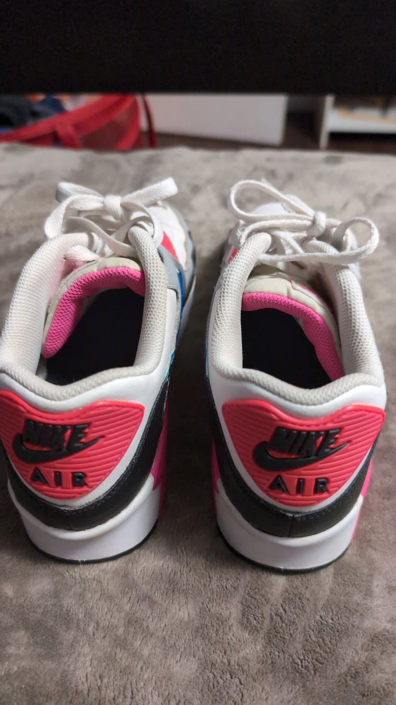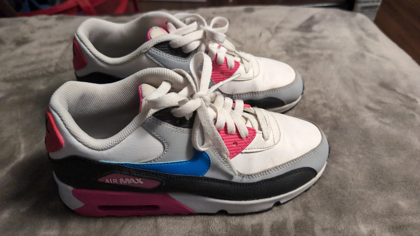 Youth Nike Air Max 90 sneakers in a white, grey, pink, and blue colourway. Size 7Y (US), 6K (UK), 40 EUR, 25 cm. Made in Vietnam.