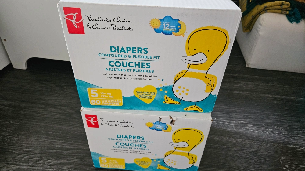 Two boxes of President's Choice diapers, size 5 (12+ kg or 27+ lbs). One box contains 60 diapers & other one has 30. Total 90 Diapers. They are contoured and flexible fit, with a wetness indicator and are hypoallergenic
