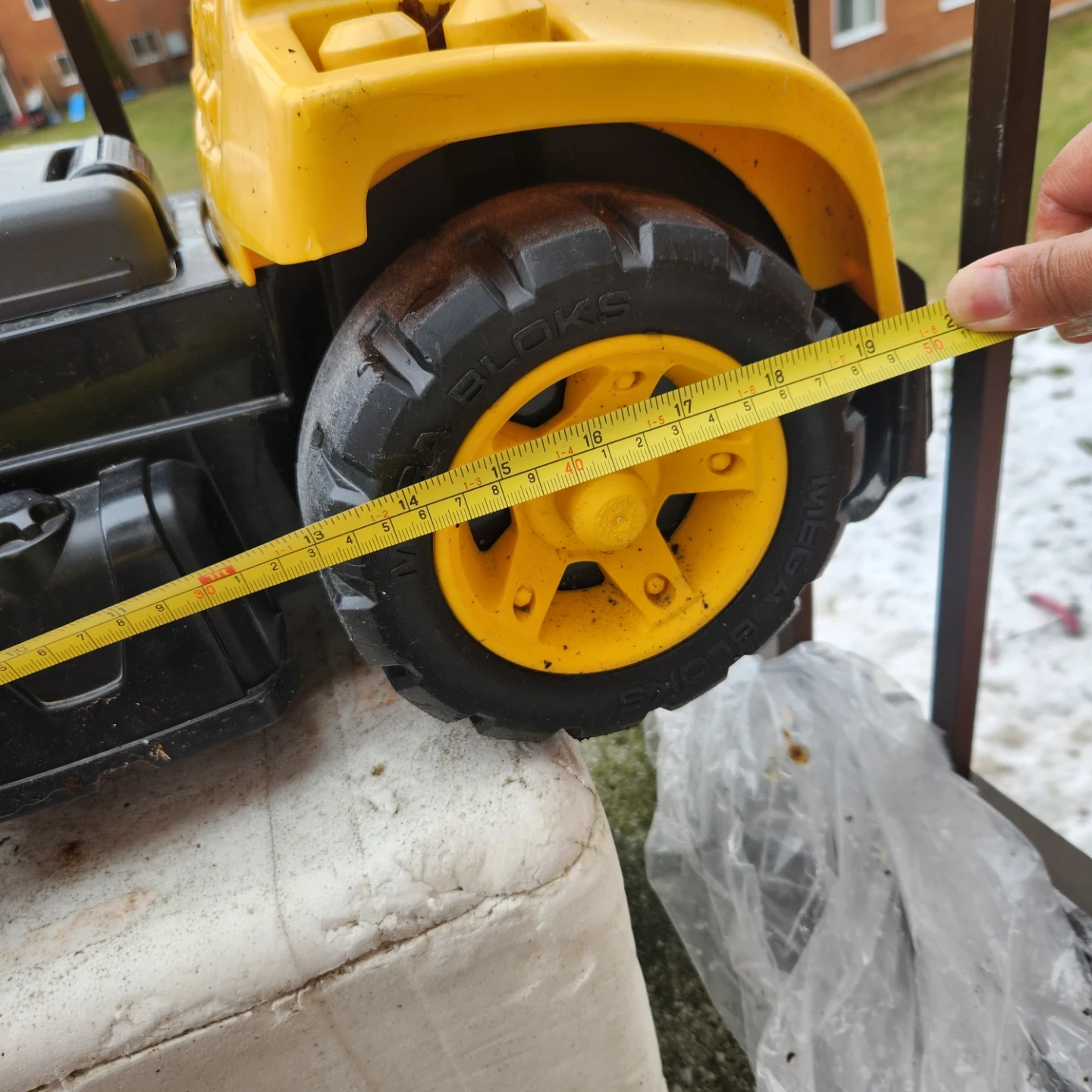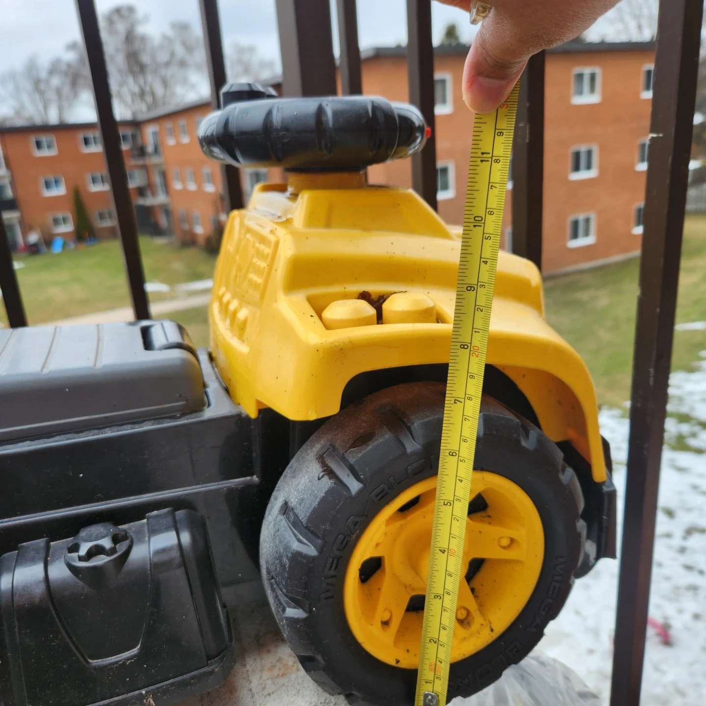 A yellow and black MEGA BLOKS ATV toy. Wheel diameter is approximately 22 x11 inches. This toy is great for outdoor play!