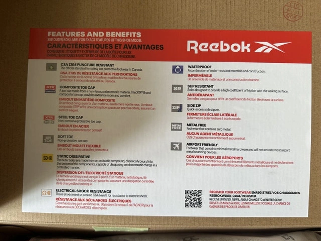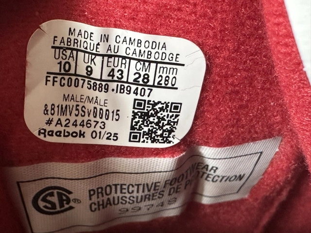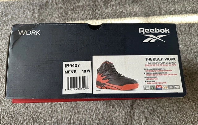 Reebok safety shoes with composite toe. Never worn. Size 10. Comes with the original box. Retail price was $180+tax. If you see this listing, they are still available.