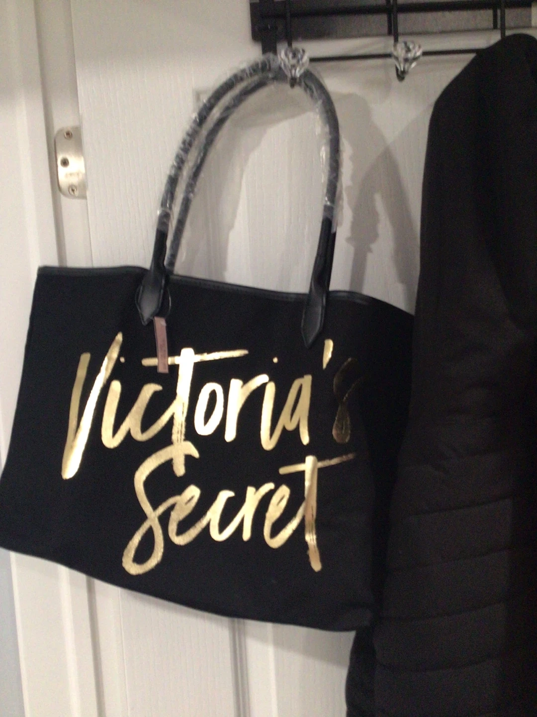 Black tote bag with gold Victoria's Secret lettering. It has two handles and a spacious interior. This bag is great for shopping trips or everyday use!