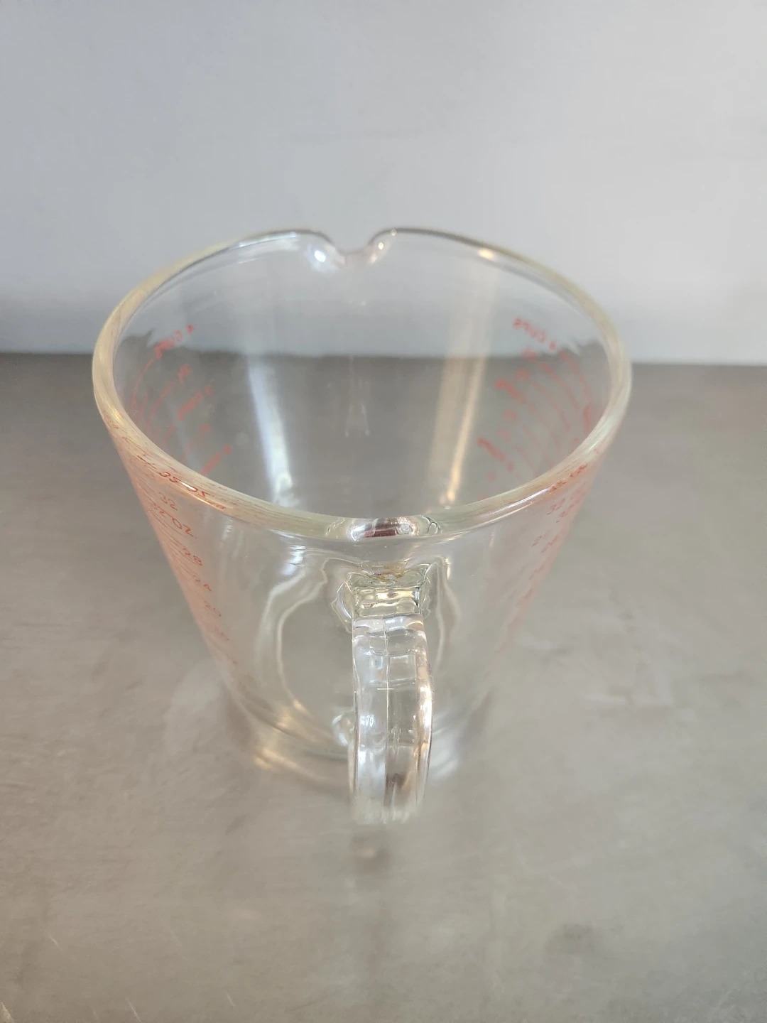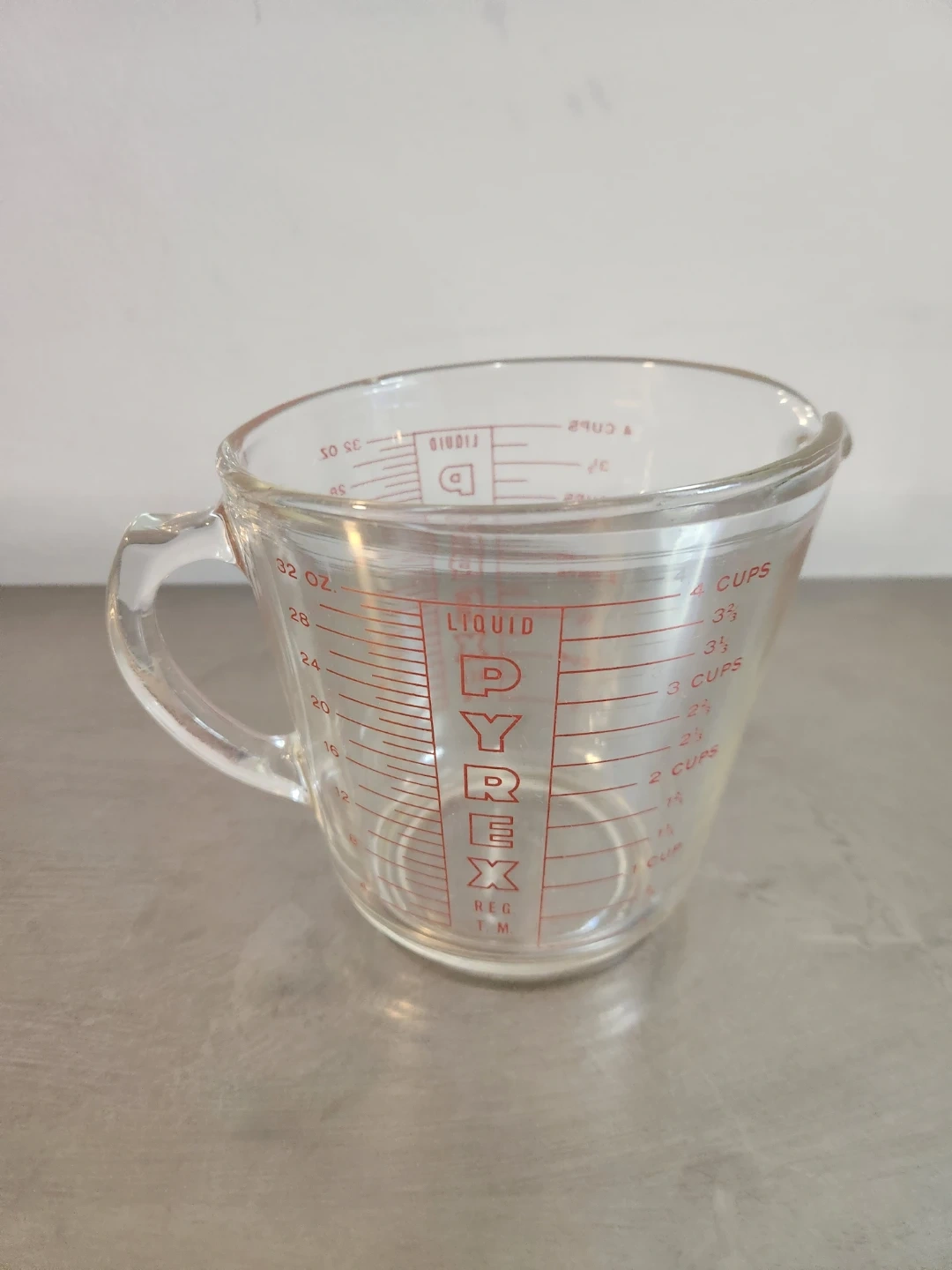 Pyrex glass measuring cup with red markings. It holds up to 4 cups or 32 ounces. This measuring cup is made of clear glass with a handle and pour spout. It's useful for all your kitchen measuring needs!