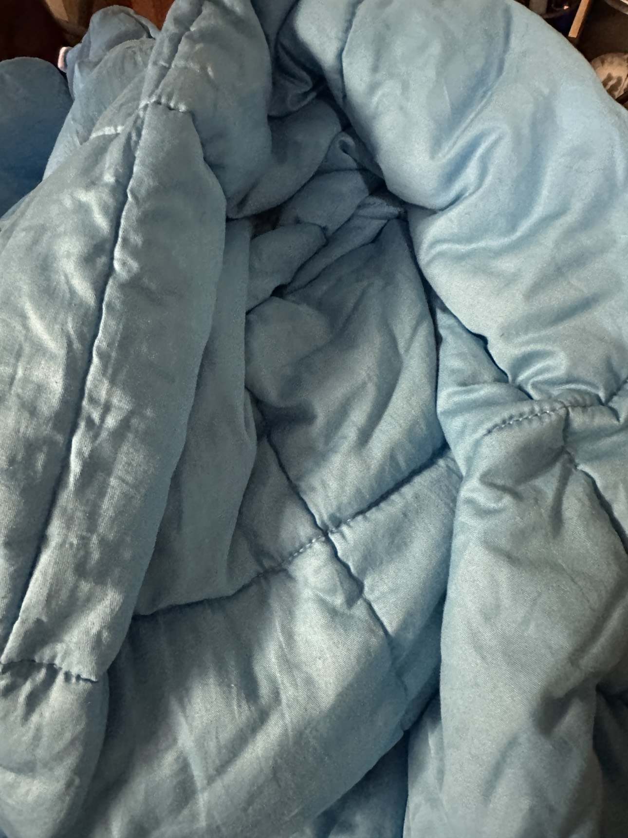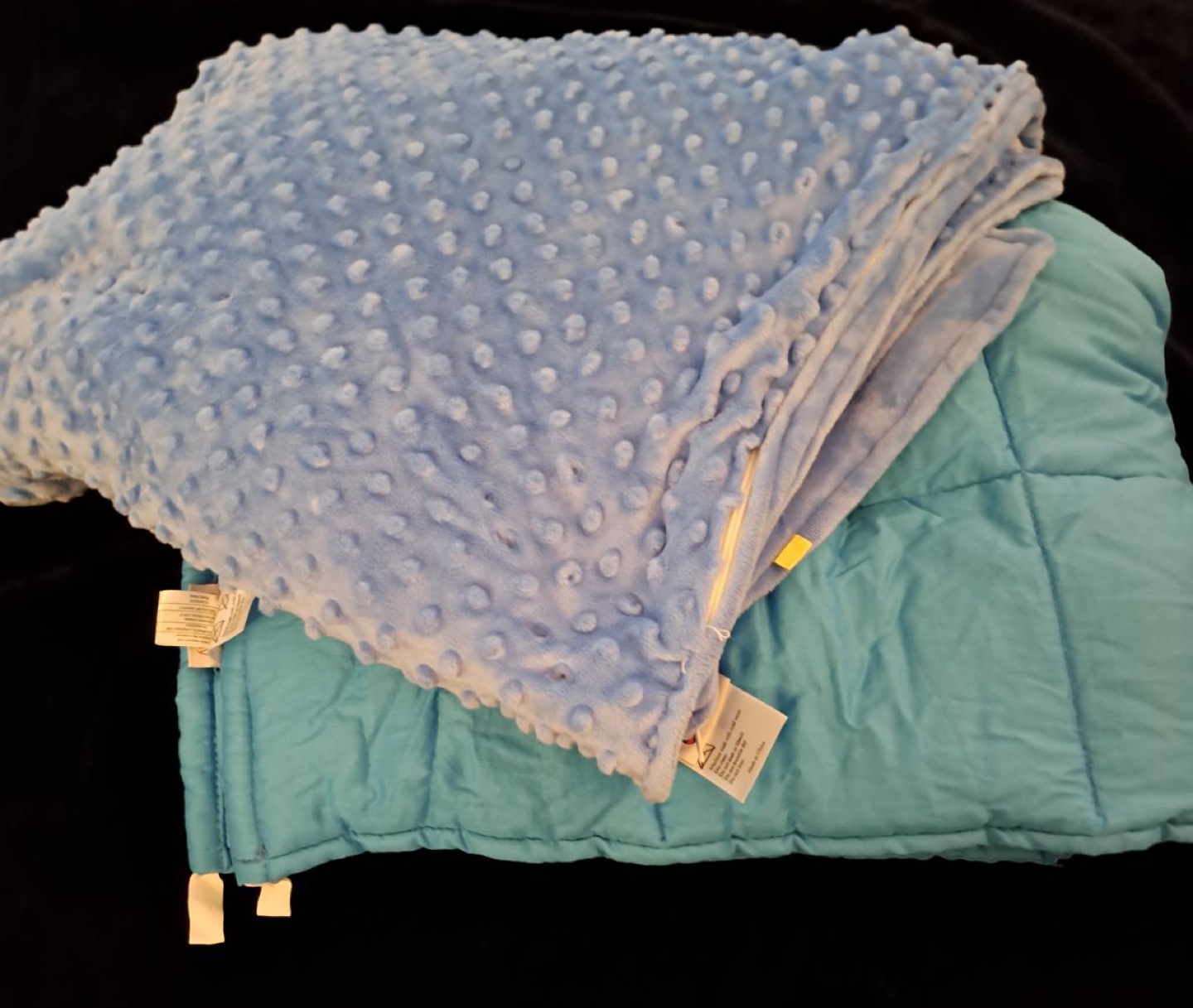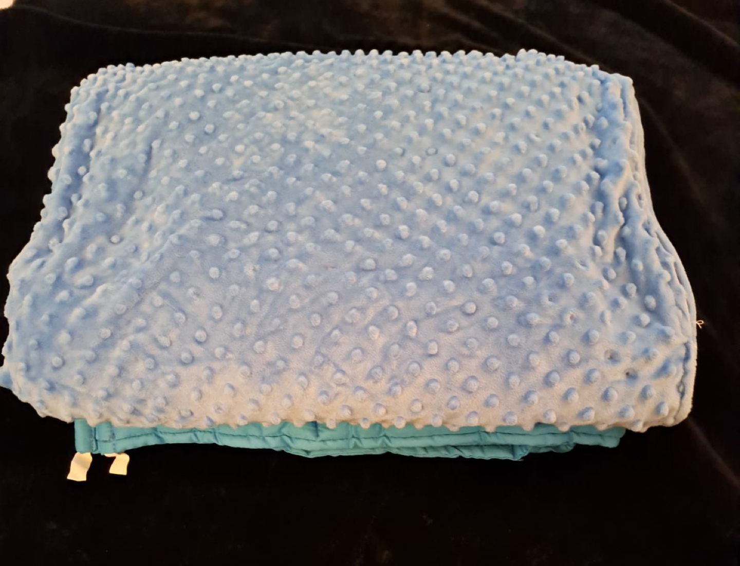 15 lbs, paid over $80. Comes with a removable, washable soft fabric covering Hardly used. Paid $80 on sale. Selling for $60 Blanket size: 78" x 48" | 198cm x 122cm Brand New 5-Layer Technology Durable Microfiber Cover: Experience the warm calming effects of ultra-soft microfiber. Machine-washable and dryer-friendly, this quilted cover is super easy to care for and will protect your blanket, keeping your mind at ease. Premium Glass Beads: Dream Away blankets use glass beads, instead of sand or plastic, to provide weight. Not only are glass beads are hypoallergenic, they also don't clump like plastic beads or sand, and their low thermal conductivity helps keep you cool while you sleep. Dense Quilting: Dream Away's dense quilting, combined with our glass beads that resist clumping, ensures that beads stay evenly distributed across our blankets. Even pressure means deeper sleep! Naturally reduce stress and anxiety with the Acupressure 15 lb Weighted Blanket by Dream Away 12.5cm x 12.5cm square compartments allow for more even weight distribution Dream Away uses innovative comfort technology to create evenly distributed micro-beads to apply deep touch pressure to simulate being held or hugged Studies have shown that deep touch pressure can help improve mood, decrease stress, fall asleep faster, and sleep better Each weighted blanket is crafted from super cozy and breathable fabric for year-round use Includes a removable machine-washable cover (see photos for the colours) Recommended for adults weighing between 100 and 200 lbs 100% super soft plush polyester. The insert shell is 60% cotton/40% polyester and the weighted fill is 92% glass beads/8% polyester. The removable cover care instructions: machine wash cold with like colours on gentle cycle. Do not bleach. Tumble dry low. Remove promptly. Do not iron. The care instructions for the glass bead insert: easy spot clean. Uses: Difficulty sleeping and helpful for sleeping issues of many kinds, such as: Autism, Sleep Apnea, Restless Leg, Narcolepsy, Jet Lag, Shift-work, Night Terrors, Work Related Stress, and Anxiety.